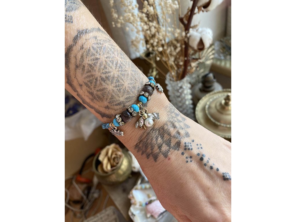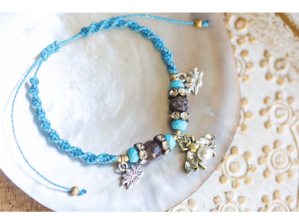Náramek včelka Náramek včelka je kromě krásného bižuterního přívěsku včelky ještě obohacen o labradority a další komponenty. Také ho zdobí jemné lotosové květy se symbolem Óm. Vše je na tyrkysové macramé šňůrce. Krásně se hodí do soupravy s tímto náramkem na nohu. Labradorit je vhodný pro bytost, která je připravená ukázat světu své skryté hlubiny. Vynáší na povrch to, co před světem ukrýváme a osvobozuje naši osobnost od starých vzorců a zábran. Odložením zábran se navrací do života spontánnost a radost. Je to také ochranný kámen šamanů a mágů, aby nesešli z cesty při propojování různých dimenzí a světů, přináší světlo, které rozjasňuje tuto cestu. Délka nastavitelná pomocí macramé zámečku.Doplňkové parametry