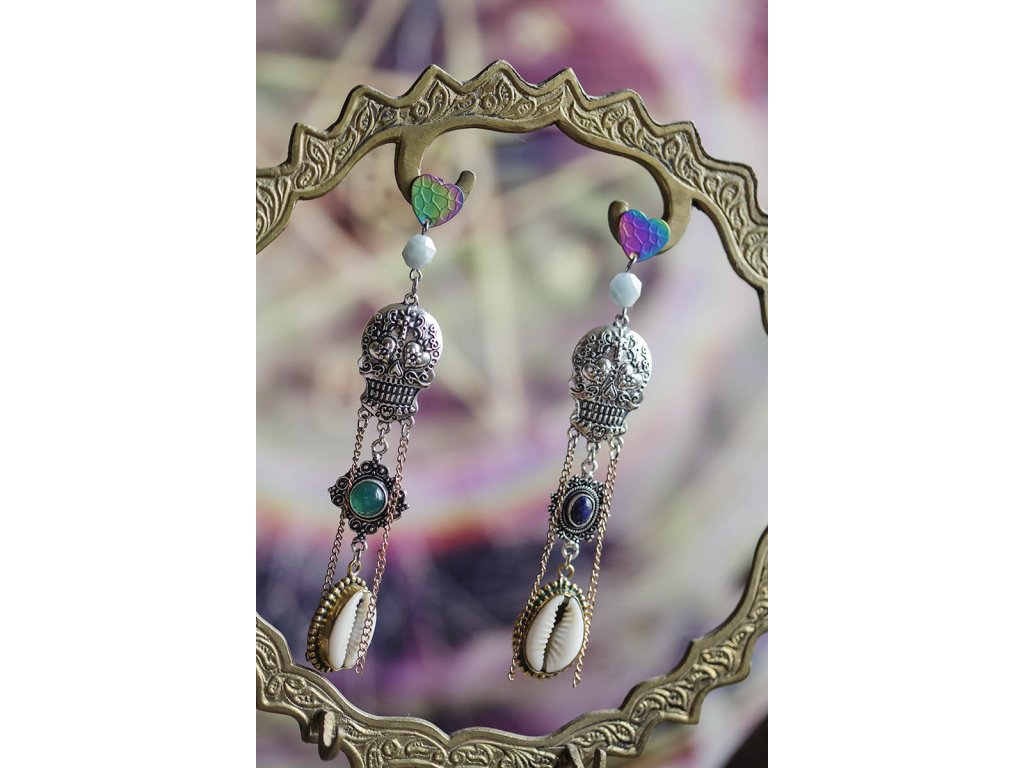 Náušnice Dia de los muertos Letošní rituální trash art náušnice tvořené již tradičně na Samhain jsou z velké části inspirované velkolepým svátkem Dia de los muertos v latinské Americe. Lebka je krásný tvar odkazující k našemu metafyzickému zálkadu a veselé barvy oslavují smrt jako dar, přechod do nové dimenze. Dva čarodejnicky fazetované namodralé morganity, zelený onyx a lapis lazuli jsou dekorativně dozdobeny přírodními mušlemi v mosazném rámečku. Tyhle originální náušnice jsou ideálním doplňkem vašeho extravagantního kostýmku, až si zas vyrazíte do světa lidí. Nechte se uchvátit: Trash art design: Náušnice jsou vyrobené z recyklovaných materiálů v duchu trash art, čímž oslavují kreativitu a ekologii. Dia de los Muertos inspirace: Lebka symbolizuje metafyzický základ a veselé barvy oslavují smrt jako přechod do nové dimenze. Magické kameny: Morganit (modrozelený): Podporuje lásku, klid a duchovní růst. Onyx (zelený): Posiluje stabilitu, odolnost a sebedůvěru. Lapis lazuli: Podporuje intuici, moudrost a vnitřní sílu. Přírodní mušle: Dodávají náušnicím nádech moře a živelnosti. Více informací: Materiál: Recyklované materiály, morganit, onyx, lapis lazuli, mosaz Velikost: Délka cca 11 cm. Hmotnost jedné náušnice cca 14 g Barva: Modrá, zelená,bílá, stříbrná Styl: Trash art, extravagantní, rituální Příležitost: Samhain, Halloween, karneval, extravagantní události Tyto rituální trash art náušnice jsou: Ručně vyrobené s láskou Dodávané v dárkové krabičce Perfektní dárek pro sebe i pro milovníky extravagantní módy a rituálů Symbol kreativity, ekologie, oslavy života a smrti Tip: Náušnice skvěle doplní kostým ve stylu Dia de los Muertos, ale také se hodí k extravagantnímu oblečení na běžné nošení. Proč si vybrat letošní rituální trash art náušnice? Podporujete kreativitu a ekologii. Vlastníte originální a jedinečný kousek. Nosíte šperk s magickou energií kamenů. Kupujete si dárek vyrobený s láskou a péčí. Dopřejte si extravagantní styl a magickou energii s letošními rituálními trash art náušnicemi!Doplňkové parametry