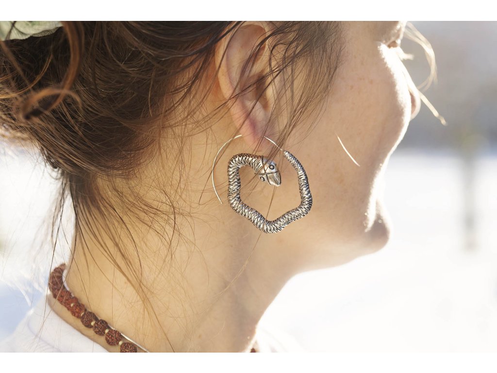 Náušnice hadí síla Neobvyklé náušnice kundaliní hadí síla z bílého kovu. Délka cca 4,5 cm Hmotnost jedné náušnice cca 6 g