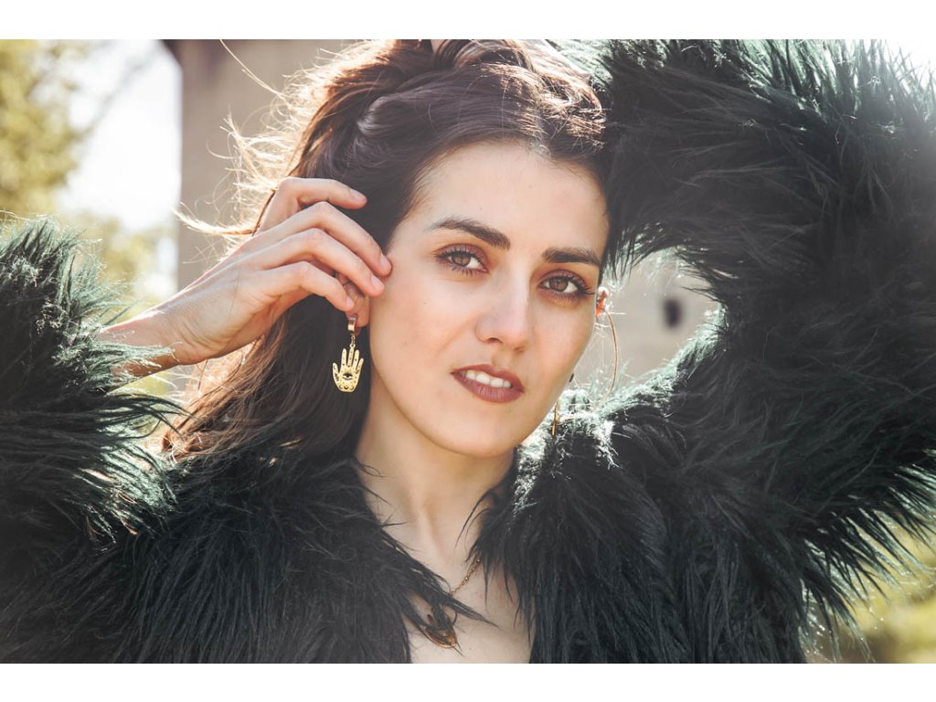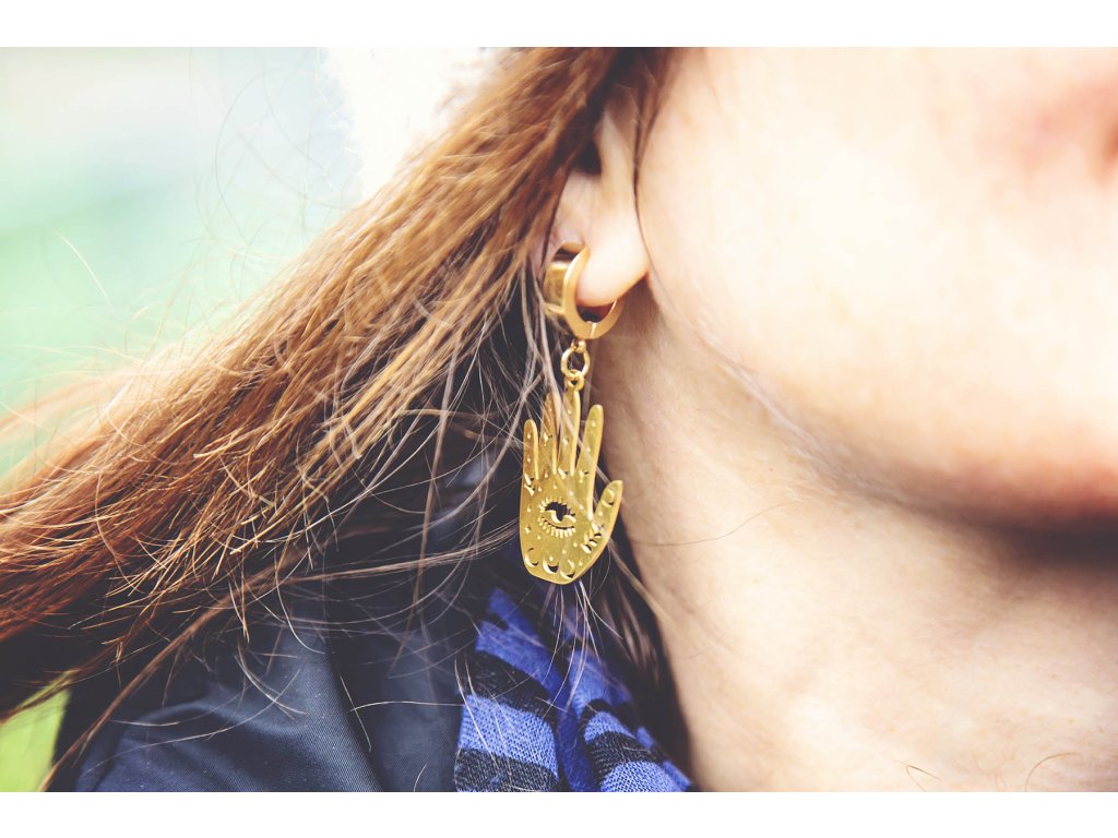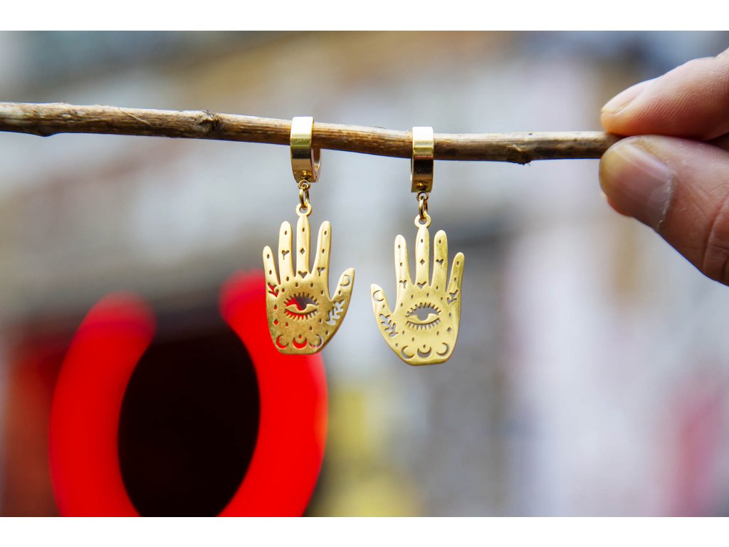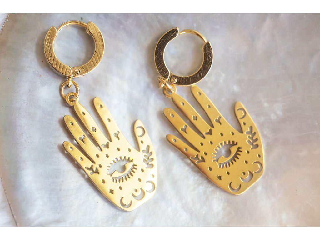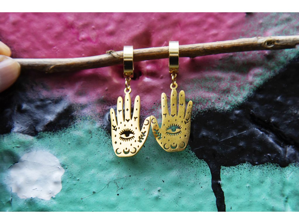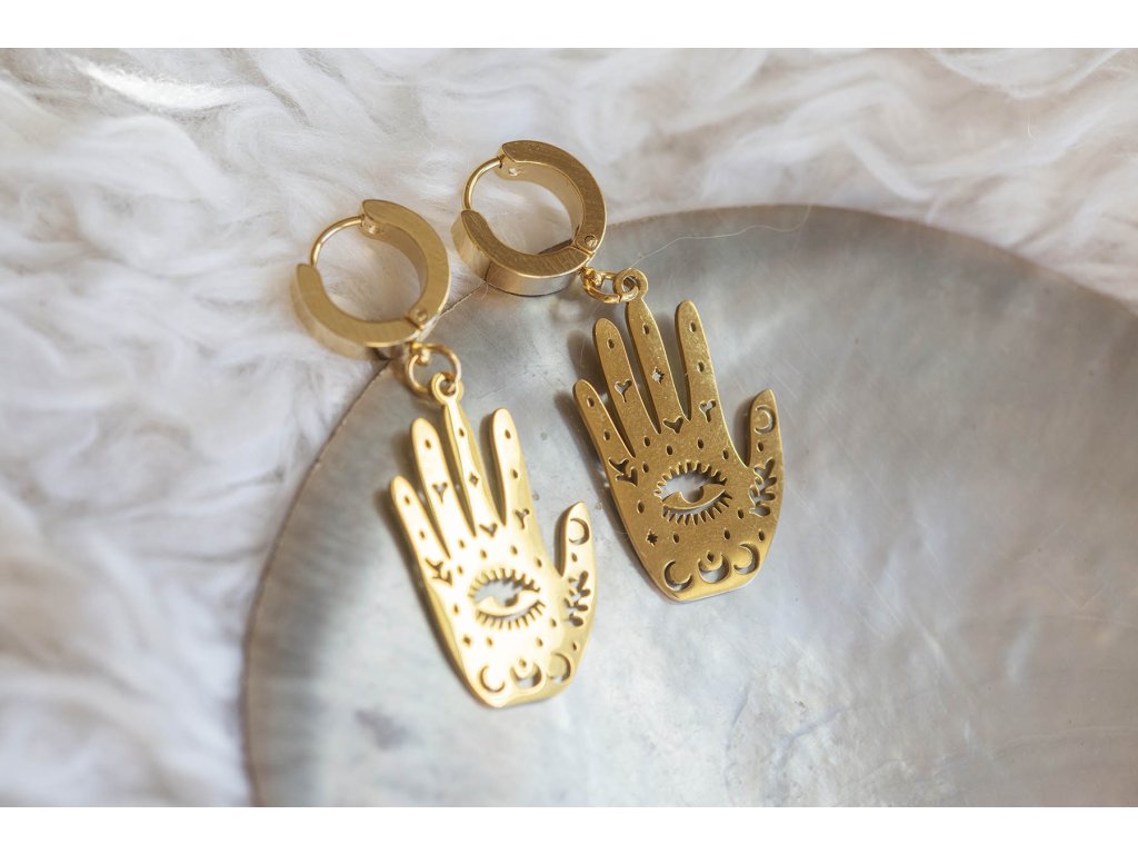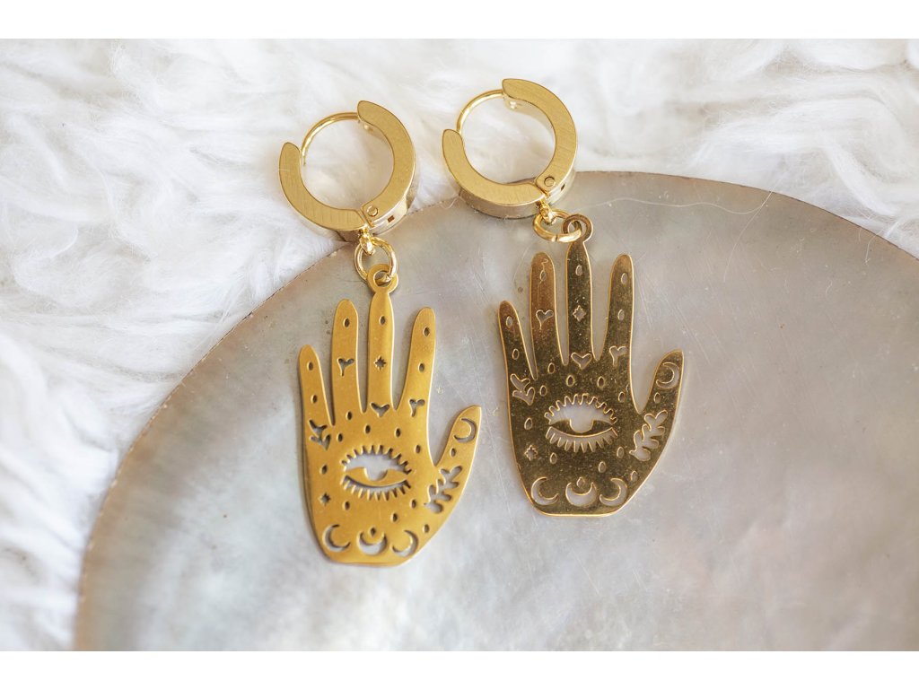 Náušnice hamsa s okem Náušnice hamsa s okem z nerezové oceli ve zlaté barvě jsou pro milovnice symbolů v netradičním pojetí. Prastarý symbol Hamsa nebo také ruka Fatimy je energeticky mocný ochranný symbol, představuje božské vedení, udává správný směr, dodává sebevědomí, zbavuje strachu, chrání před neštěstím, ochraňuje slabé a nemocné. Délka i se závěsem cca 4,5 cm Hmotnost jedné náušnice cca 4 gDoplňkové parametry