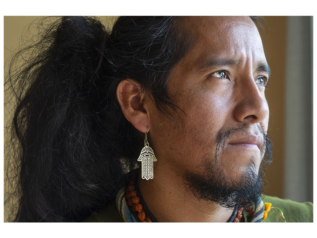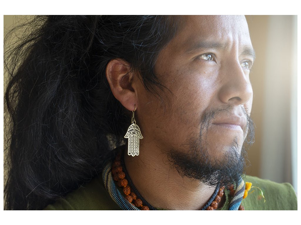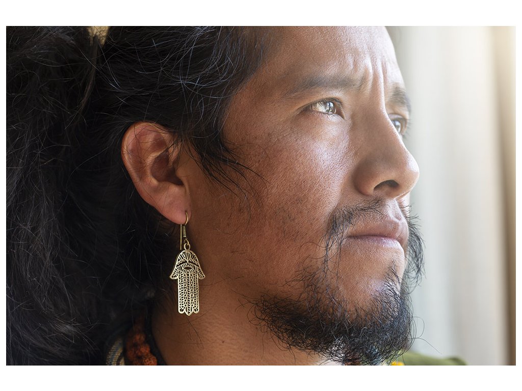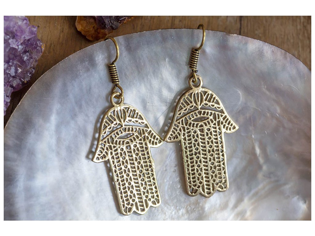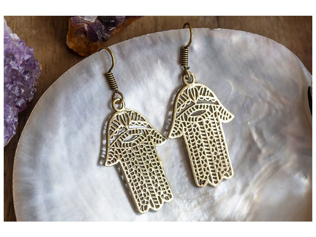 Náušnice Hamsy Náušnice Hamsy vyrobené z kvalitní nečernající mosazi. Prastarý symbol Hamsa nebo také ruka Fatimy je energeticky mocný ochranný symbol, představuje božské vedení, udává správný směr, dodává sebevědomí, zbavuje strachu, chrání před neštěstím, ochraňuje slabé a nemocné. Délka: 60mm Hmotnost jedné náušnice: 5gDoplňkové parametry
