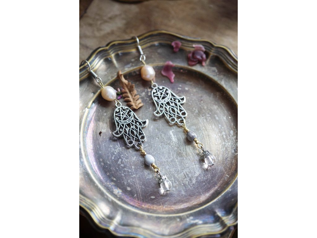 Náušnice Hamsy s perlami Překrásné jedinečné náušnice hamsy s růžovými perlami a šedavým lotosovým semínkem, jsou díky Venušinu pentagramu skvělou ozdobou pro všechny dobré čarodějky. Prastarý symbol Hamsa nebo také ruka Fatimy je energeticky mocný ochranný symbol, představuje božské vedení, udává správný směr, dodává sebevědomí, zbavuje strachu, chrání před neštěstím, ochraňuje slabé a nemocné. Pentagram symbolizuje ve sém pravém historickém významu světlo Venuše. Symbol pentagramu má ale mnoho interpretací. Mimo jiné vás dokáže do jisté míry ochránit nejen před chaosem, ale i zlým úmyslem, protože jeho prvotní schopností je dát věcem řád, tedy vracet zlo do mezí, které nemá překračovat. Perly vnášejí do života rovnováhu, racionalitu a zabraňují negativním vlivům. Perla vám bude sloužit jako osobní ochranný amulet, posílí vaší intuici a vůli dosáhnout vytyčených cílů. Jsou také symbolem moci, hojnosti a bohatství, které ale může mít, jak víme, mnohou podobu... Délka cca 11,5 cm Hmotnost jedné náušnice cca 7 gDoplňkové parametry