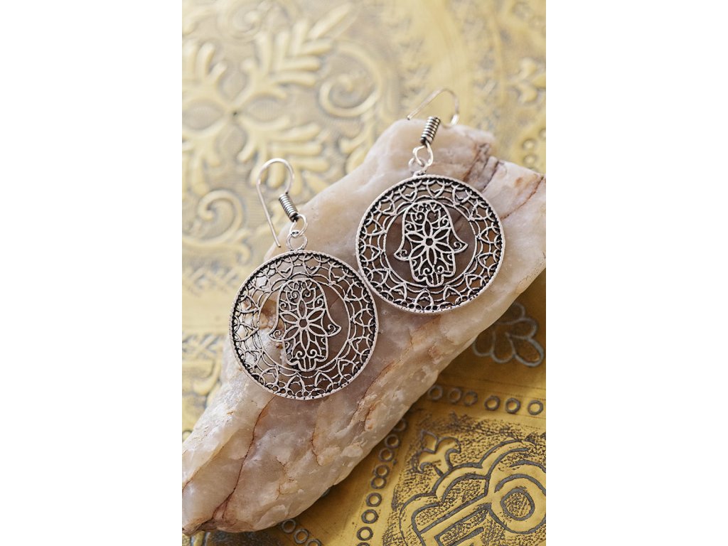 Náušnice hamsy v mandale Krásné jemné mandaly s hamsou z bílého kovu. Prastarý symbol Hamsa nebo také ruka Fatimy je energeticky mocný ochranný symbol, představuje božské vedení, udává správný směr, dodává sebevědomí, zbavuje strachu, chrání před neštěstím, ochraňuje slabé a nemocné. Délka cca 5,5 cm Hmotnost jedné náušnice cca 5 gDoplňkové parametry