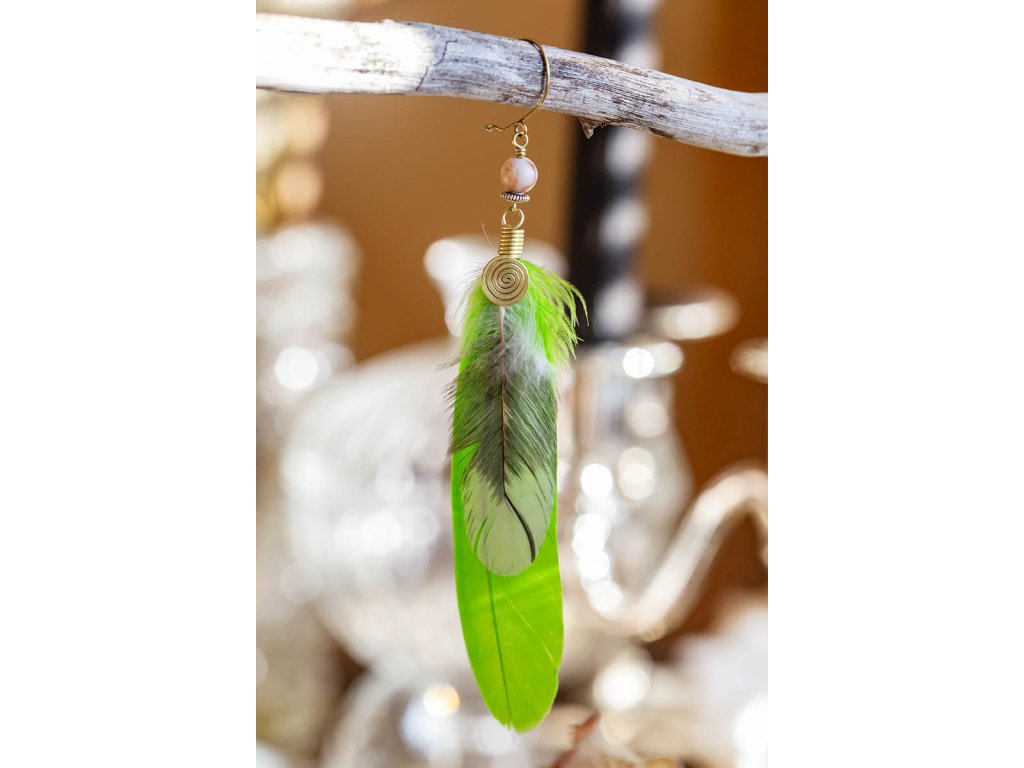 Náušnice indiánské peříčko s jaspisem Nádherná solitérní náušnice indiánské peříčko s jaspisem a mosaznou spirálou. Šperk byl navržen a ručně vytvořen v dílně našeho milého přítele a kolegy, kečuánského indiána Arona. Jeho tvorba vychází z tradičních peruánských technik výroby šperků. Jaspis přináší do života klid, pomáhá ve stresu, uvádí do rovnováhy duševní i tělesnou stránku. Umožňuje dosahování cílů, tím že podporuje pronikavost vhledu na podstatu problému. Zvyšuje organizační schopnosti a schopnost dělat rychlá a správná rozhodnutí. Chrání před negativní energií. Je výborným pomocníkem v pracovním i soukromém životě. Délka cca 12 cm Hmotnost náušnice cca 1 gDoplňkové parametry