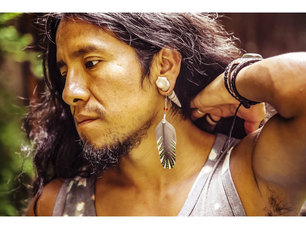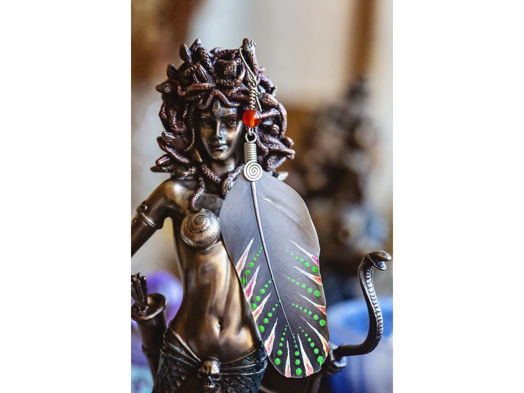 Náušnice indiánské peříčko s karneolem Zdobená solitérní náušnice indiánské peříčko s karneolem a s alpakovou spirálou. Šperk byl navržen a ručně vytvořen v dílně našeho milého přítele a kolegy, kečuánského indiána Arona. Jeho tvorba vychází z tradičních peruánských technik výroby šperků. Karneol je plný životní síly a jeho energetická hodnota podněcuje tvořivost a sebedůvěru. Podporuje obnovení vitality, motivace a koncentrace, Povzbuzuje sexualitu. Chrání před závistí a záští. Zmírňuje žárlivost a dodává odvahu v těžkých životních volbách a situacích. Podněcuje k pozitivnímu pohledu na svět. Je skvělý na pracoviště. Přináší štěstí, prosperitu, podporuje analytické myšlení a zmírňuje tlak, který na vás vytváří kolegové či šéf. Je talismanem pro úspěch. Pomáhá odstranit strach ze smrti. Délka cca 11 cm Hmotnost náušnice cca 1 gDoplňkové parametry