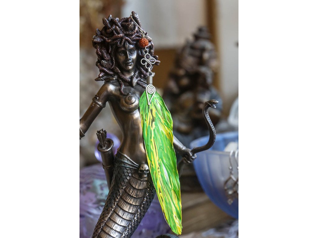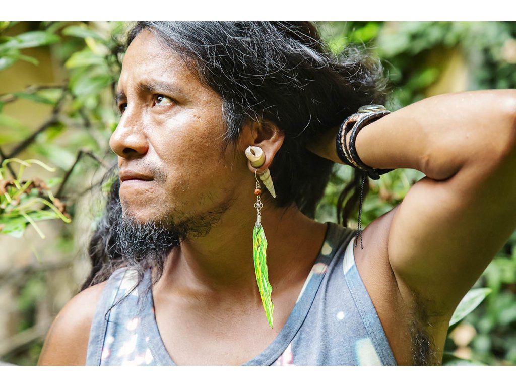 Náušnice indiánské peříčko s rudrakshou Zdobená solitérní náušnice indiánské peříčko s rudrakshou a alpakovou spirálou. Šperk byl navržen a ručně vytvořen v dílně našeho milého přítele a kolegy, kečuánského indiána Arona. Jeho tvorba vychází z tradičních peruánských technik výroby šperků. Rudraksha je přírodní semínko z věčně zeleného stromu Elaeocarpus ganitrus, který roste od úpatí Himalájí, v Nepálu a Indii až po jihovýchodní Asii. V překladu slovo rudraksha znamená Boží slzy a jsou to slzy soucitu boha Šivy. Rudraksha vytváří pozitivní energii pro tělo i duši, dokáže změnit karmu nositele. Tlumí stres, zklidňuje mysl a přináší do ní mír. Má proti stárnoucí účinky. Používá se i jako pomocník při meditacích. Délka cca 15 cm Hmotnost náušnice cca 2 gDoplňkové parametry