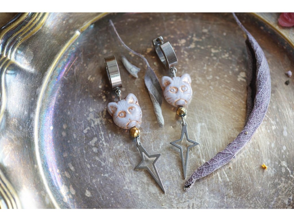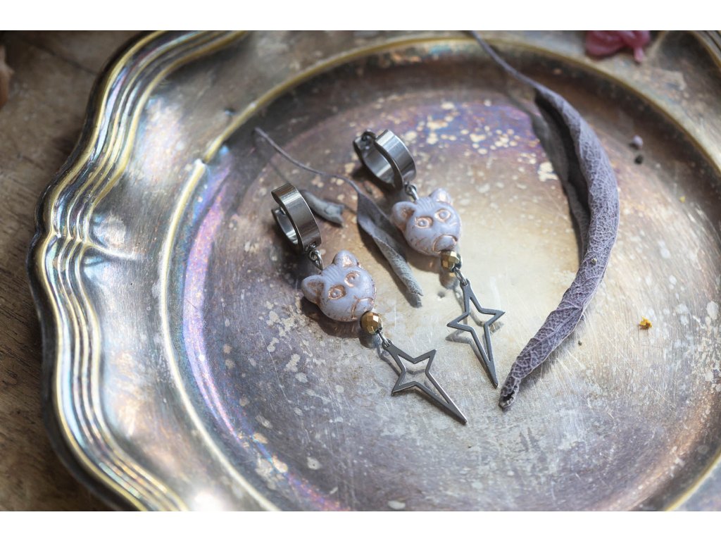 Náušnice kočky s hematitem Nerezové kroužky a hvězdičky se skleněným korálkem kočky od českých sklářů a s pokoveným fasetovaným hematitem - to jsou tyto originální náušnice pro moderní Babu Jagu. Budou vás určitě bavit. Hematit je zvláště účinný při uzemnění a jako ochranný kámen. Uvádí do rovnováhy tělo, mysl i ducha. Nese v sobě silný element jang a zajišťuje rovnováhu meridiánů, čímž napravuje nevyváženost prvku jin. O hematitu se píše, že působí zvlášť blahodárně v situacích spojených s právem a zákony. Silně působí také v duševní rovině. Pomáhá plachým osobám zvyšovat sebevědomí a podporuje schopnost přežít. Dodává větší vůli k životu a rozvíjí spolehlivost. Zvyšuje rovněž důvěryhodnost. Tento kámen odstraňuje omezení, která si jeho majitel v minulosti sám stanovil, a napomáhá rozvoji osobnosti. Účinně asistuje při překonávání různých nutkání a návyků. Hematit obrací pozornost k nenaplněným touhám představujícím hnací motor lidského života. Délka cca 6 cm Hmotnost jedné náušnice cca 4 gDoplňkové parametry