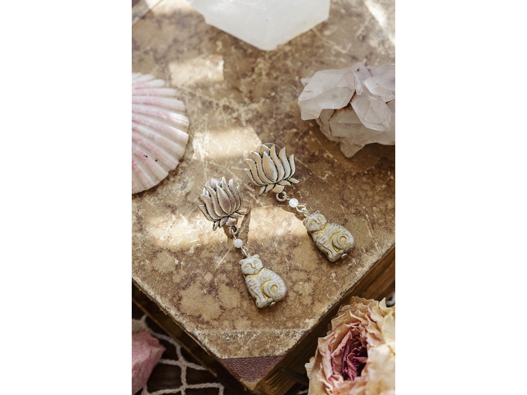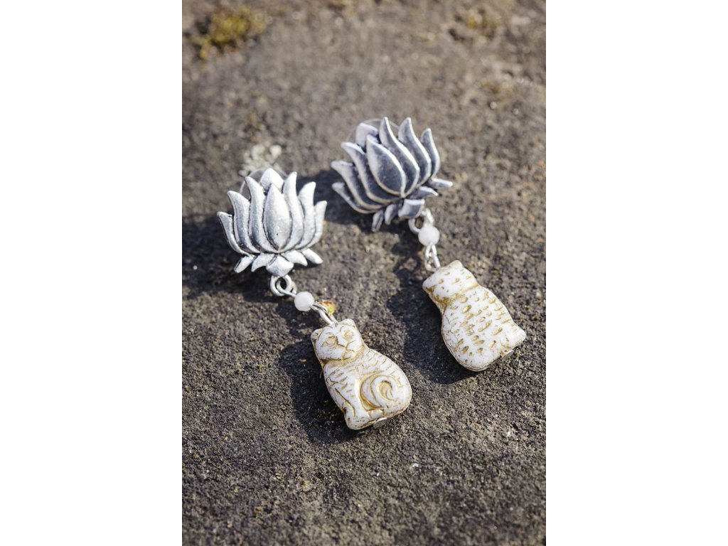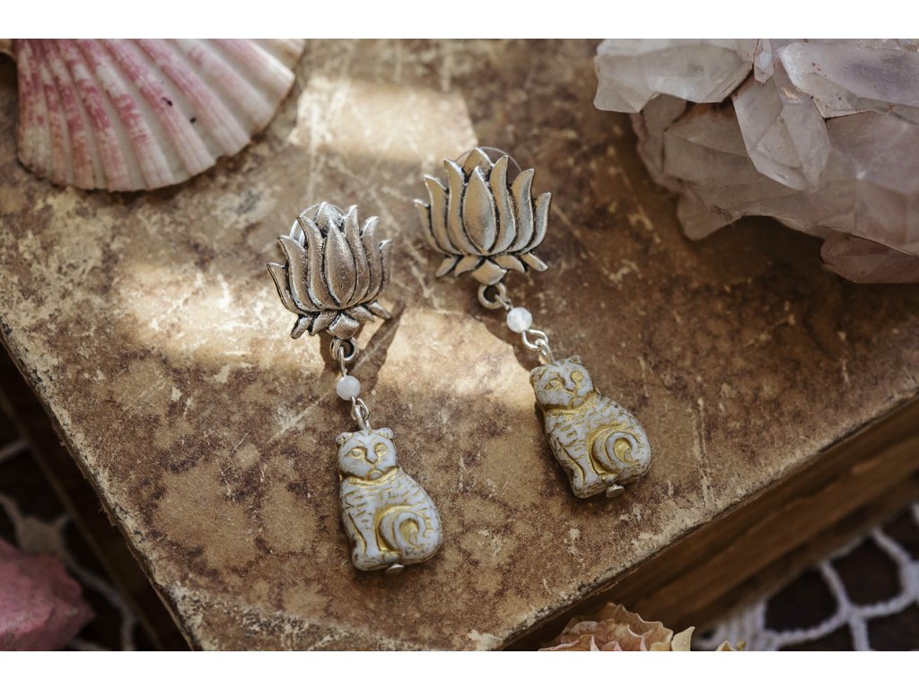 Náušnice kočky s měsíčním kamenem Kočky s měsíčním kamenem jsou náušnice pro milovnice kočičí rasy a ženských energií, jelikož měsíční kámen vibruje vysoce ženskou energií a zároveň ji jemným způsobem harmonizuje. Krásně vypracované přívěsky ve tvaru krémově zbarvených koček jsou úžasné korálky vytvořené českými skláři.Doplňkové parametry