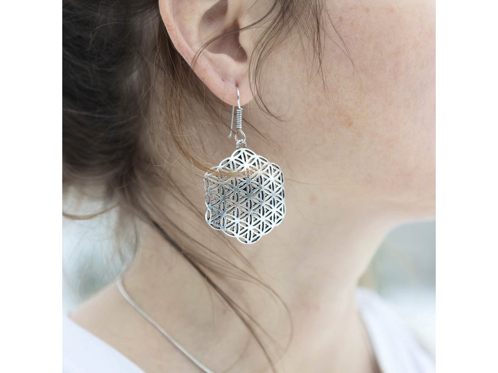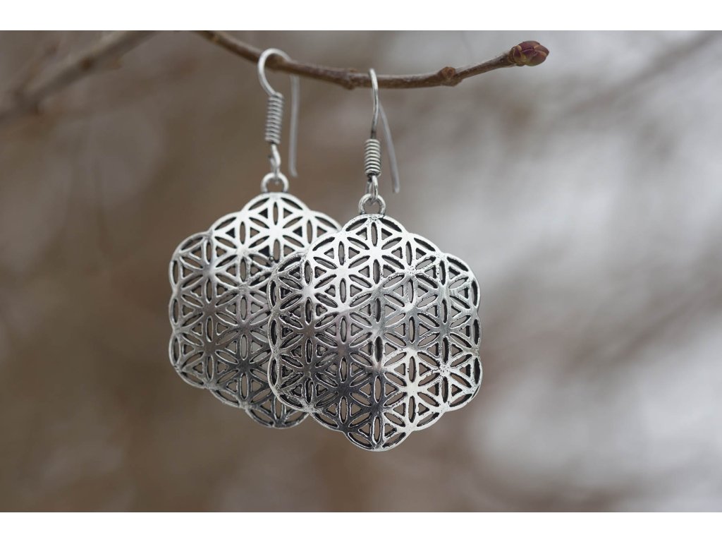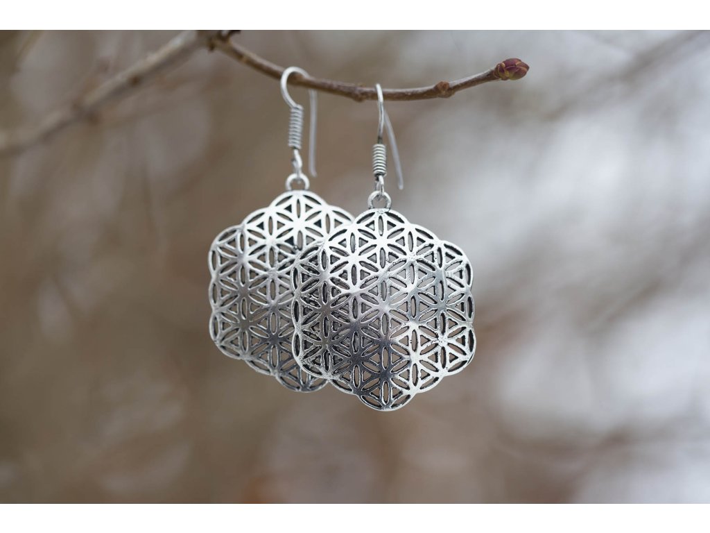 Náušnice květ života Tyto krásné náušnice květ života z bílého kovu jsou jak výraznou ozdobou, tak mocným symbolem, který vás jemně vyladí. Květ života – symbol posvátné geometrie je nalézán v různých místech mnoha kultur na celé planetě. Léčí tělo i duši, harmonizuje osobnost, dodává energii, pomáhá napojit se na božskou sílu, na vesmírné světlo. Délka cca 6 cm Hmotnost jedné náušnice cca 10 gDoplňkové parametry