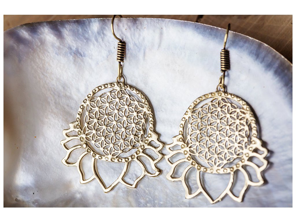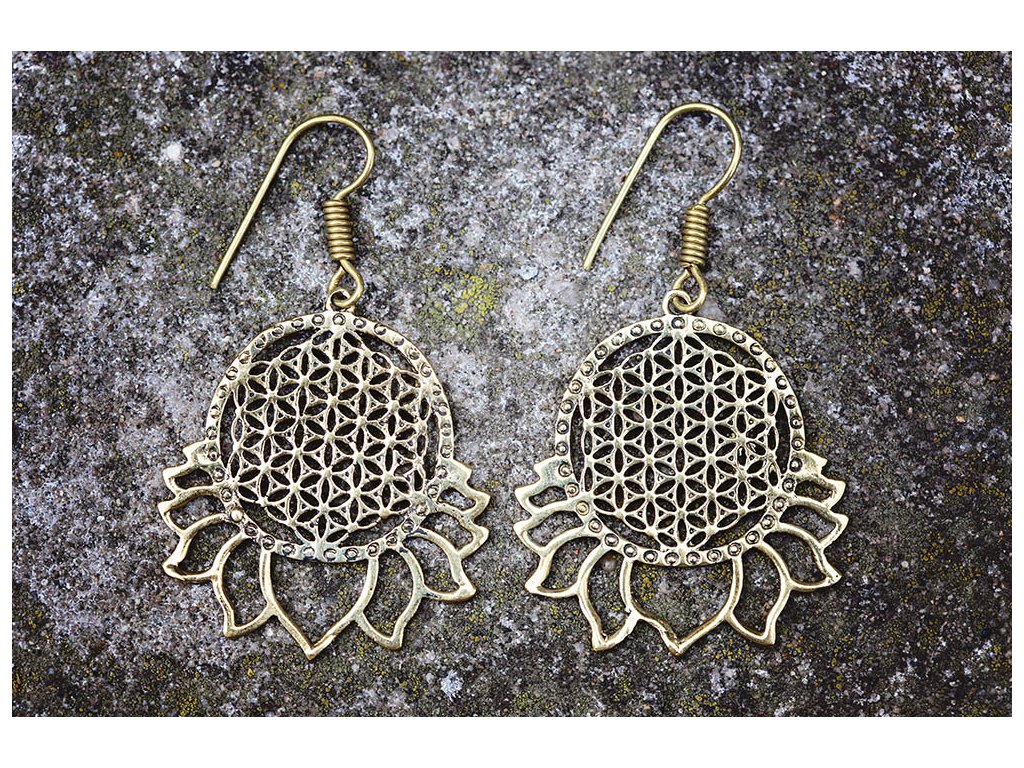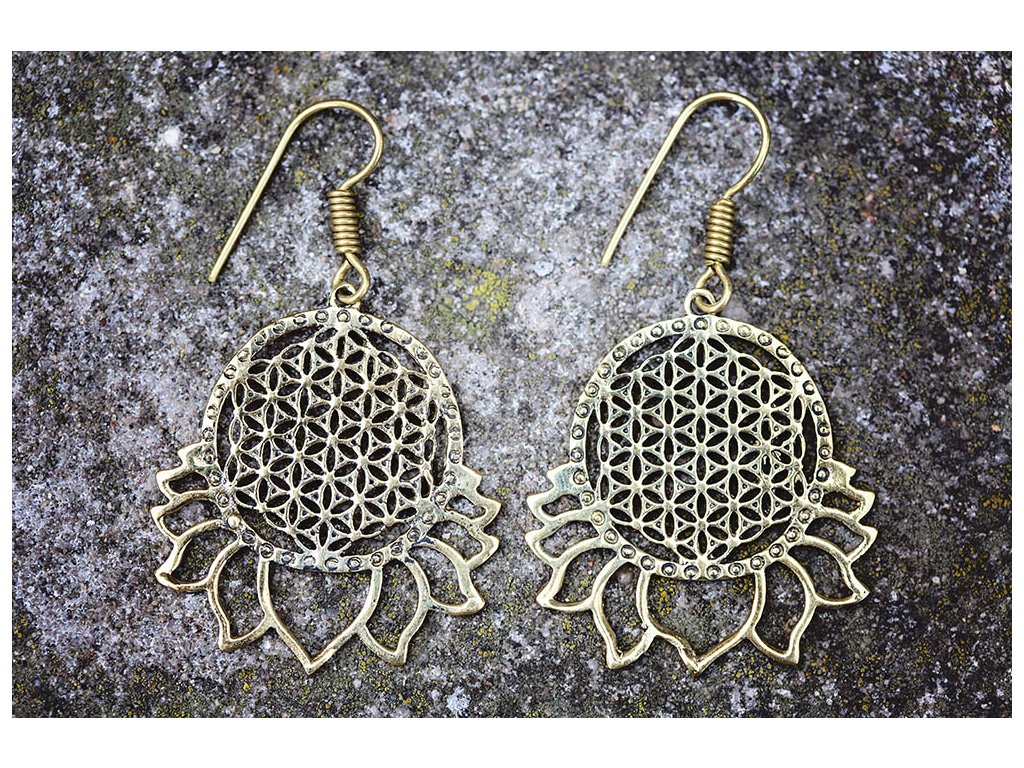 Náušnice květy života v lotosu Zajímavé mosazné náušnice. Květ života je symbol posvátné geometrie je nalézán v různých místech mnoha kultur na celé planetě. Léčí tělo i duši, harmonizuje osobnost, dodává energii, pomáhá napojit se na božskou sílu, na vesmírné světlo. S lotosem se často setkáváme v prastarých kulturách různých národů. Je symbolem znovuzrození, krásy, života, štěstí, čistoty a duchovnosti, jednoty mikro a makrokosmu, symbolem rovnováhy mužského a ženského počátku. Lotosový květ napomáhá zrození harmonie a lásky uvnitř nás. Materiál: Vysoce kvalitní mosaz Délka: cca 39 mm Hmotnost jedné náušnice: cca 5 gDoplňkové parametry