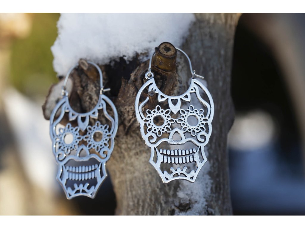 Náušnice lebka Nevšední čarodějnické náušnice ve tvaru zdobené lebky. Délka cca 5,5 cm Hmotnost jedné náušnice cca 6 g