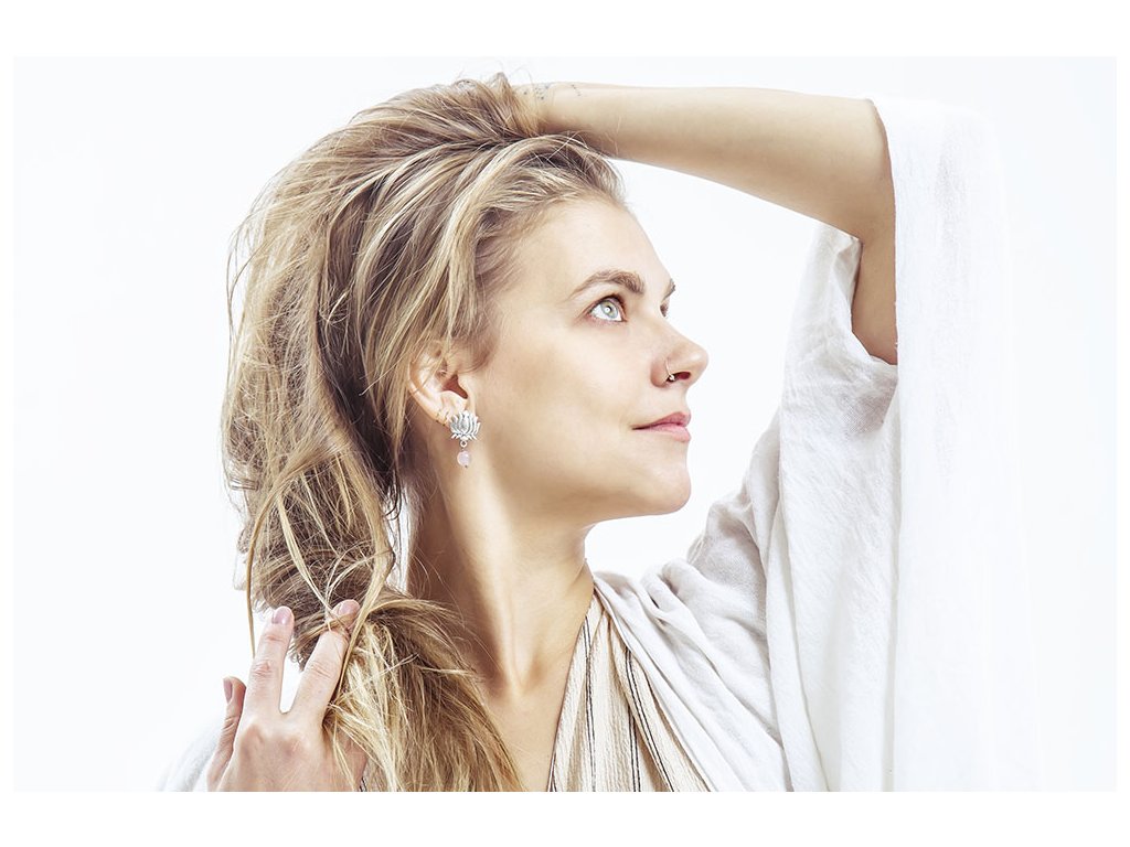 Náušnice Lotos a růženín Tyto náušnice jsou jemné, ale vládnou silnou energií vznikající spojením symbolu lotosového květu a růženínu. Růženín je kámen lásky. Pomáhá projevovat city, dodává lásku a krásu, podporuje něžnost, mírnost, přátelskost a nesobeckost. Podněcuje citlivost a vnímavost vůči ostatním i sobě samému, podporuje fantazii, inspiraci a tvořivost a trpělivost. Dává sílu k odpuštění, učí sebeúctě a sebelásce. S lotosem se často setkáváme v prastarých kulturách různých národů. Je symbolem znovuzrození, krásy, života, štěstí, čistoty a duchovnosti, jednoty mikro a makrokosmu, symbolem rovnováhy mužského a ženského počátku. Lotosový květ napomáhá zrození harmonie a lásky uvnitř nás. Délka cca 30 mm Hmotnost jedné náušnice cca 3 gDoplňkové parametry