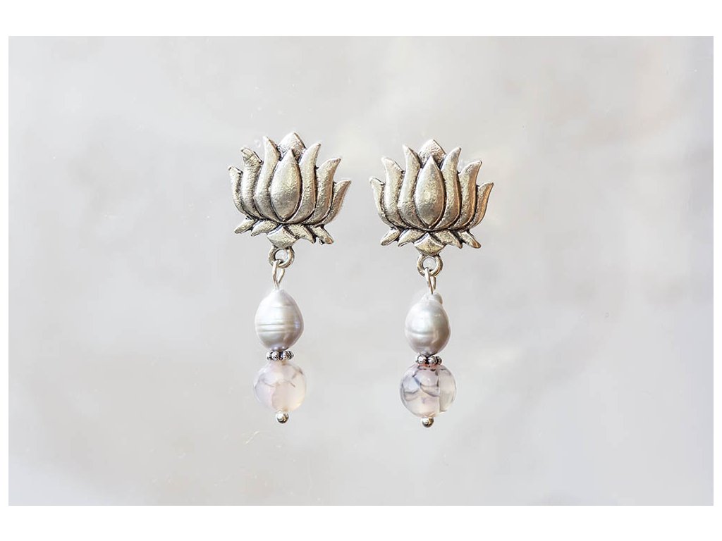 Náušnice lotos s perlou a achátem Krásné jemné náušnice s mosazným lotosem a drahokamy. S lotosem se často setkáváme v prastarých kulturách různých národů. Je symbolem znovuzrození, krásy, života, štěstí, čistoty a duchovnosti, jednoty mikro a makrokosmu, symbolem rovnováhy mužského a ženského počátku. Lotosový květ napomáhá zrození harmonie a lásky uvnitř nás. Achát podporuje vnitřní stabilitu, vyrovnanost a zralost, pocit bezpečí a sebevědomí. Usnadňuje třídění myšlenek, napomáhá při řešení komplikovaných úkolů. Ve vztazích podporuje věrnost a chápavost. Upevňuje rodinná a přátelská pouta. Perly vnášejí do života rovnováhu, racionalitu a zabraňují negativním vlivům. Perla vám bude sloužit jako osobní ochranný amulet, posílí vaší intuici a vůli dosáhnout vytyčených cílů. Jsou také symbolem moci, hojnosti a bohatství, které ale může mít, jak víme, mnohou podobu... Délka: 40 mm Hmotnost jedné náušnice: 3,5 gDoplňkové parametry