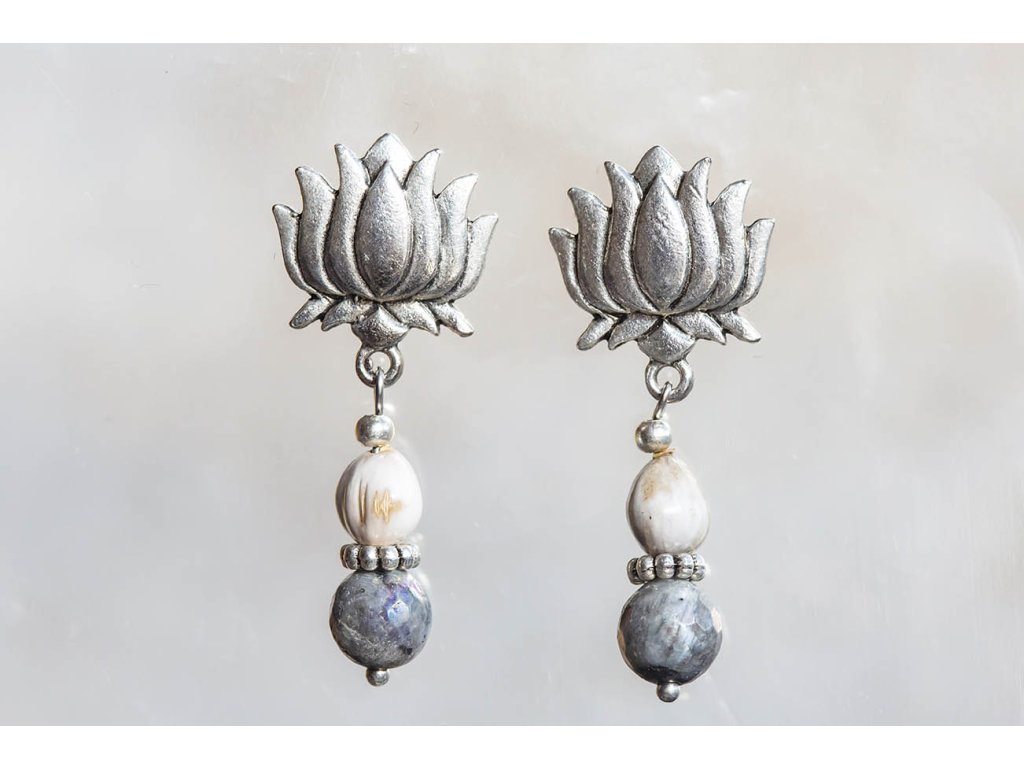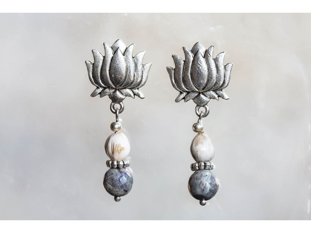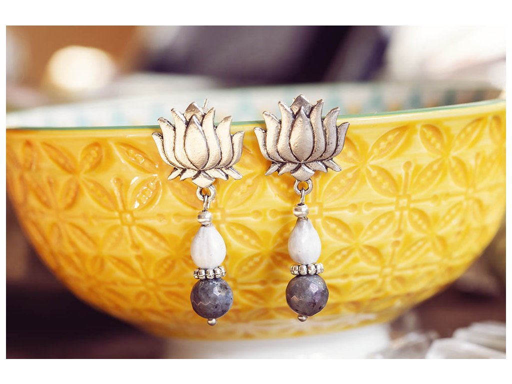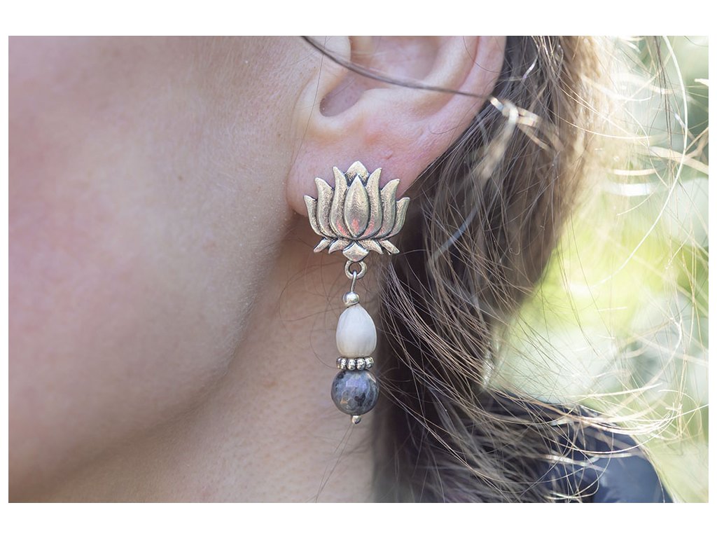 Náušnice lotosy Náušnice Lotosy zdobené fasetovanými labradority s duhovou úpravou povrchu. Materiál bronz zdobený alpakou. S lotosem se často setkáváme v prastarých kulturách různých národů. Je symbolem znovuzrození, krásy, života, štěstí, čistoty a duchovnosti, jednoty mikro a makrokosmu, symbolem rovnováhy mužského a ženského počátku. Lotosový květ napomáhá zrození harmonie a lásky uvnitř nás. Labradorit je vhodný pro bytost, která je připravená ukázat světu své skryté hlubiny. Vynáší na povrch to, co před světem ukrýváme a osvobozuje naši osobnost od starých vzorců a zábran. Odložením zábran se navrací do života spontánnost a radost. Je to také ochranný kámen šamanů a mágů, aby nesešli z cesty při propojování různých dimenzí a světů, přináší světlo, které rozjasňuje tuto cestu. Délka: 42 mm Hmotnost jedné náušnice: 3 gDoplňkové parametry