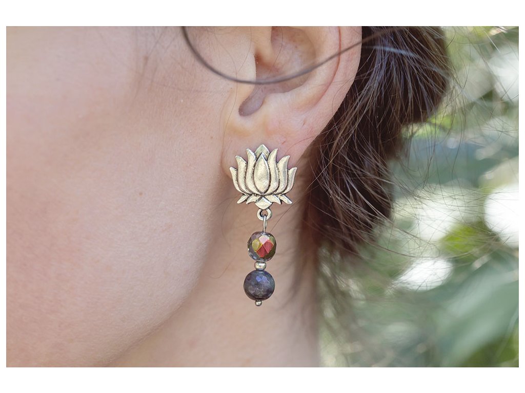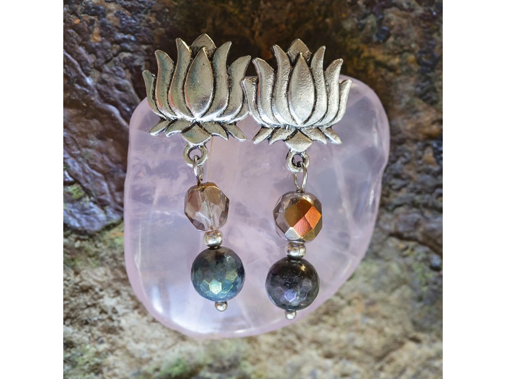 Náušnice lotosy Náušnice Lotosy zdobené korálky. Materiál bronz zdobený alpakou. S lotosem se často setkáváme v prastarých kulturách různých národů. Je symbolem znovuzrození, krásy, života, štěstí, čistoty a duchovnosti, jednoty mikro a makrokosmu, symbolem rovnováhy mužského a ženského počátku. Lotosový květ napomáhá zrození harmonie a lásky uvnitř nás. Délka: 42 mm Hmotnost jedné náušnice: 3 gDoplňkové parametry