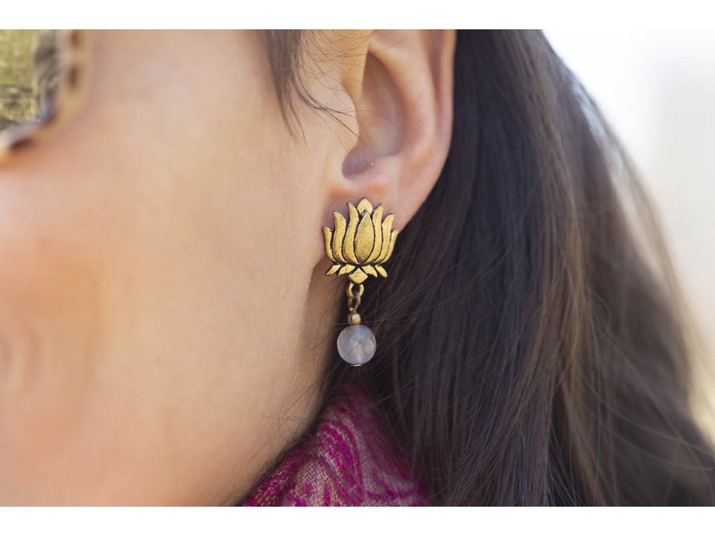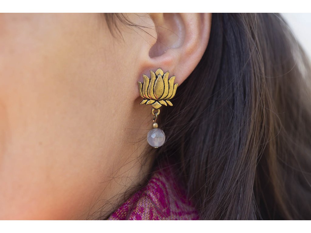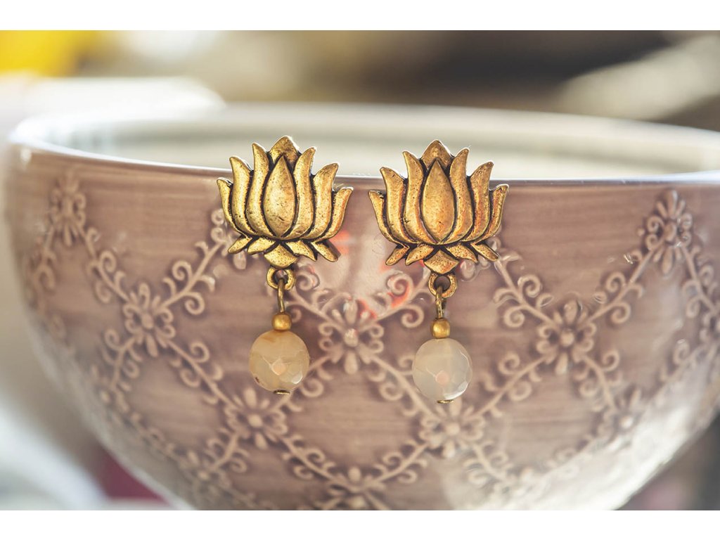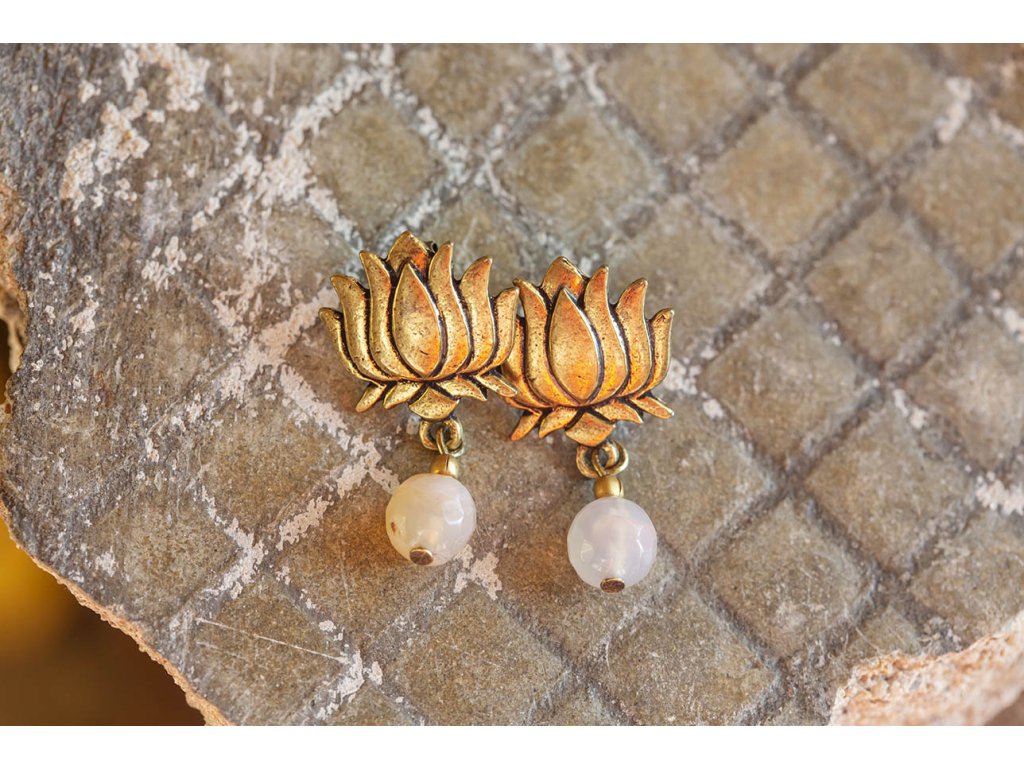 Náušnice lotosy s acháty Mosazné lotosy s fasetovanými acháty. Achát podporuje vnitřní stabilitu, vyrovnanost a zralost, pocit bezpečí a sebevědomí. Usnadňuje třídění myšlenek, napomáhá při řešení komplikovaných úkolů. Ve vztazích podporuje věrnost a chápavost. Upevňuje rodinná a přátelská pouta. S lotosem se často setkáváme v prastarých kulturách různých národů. Je symbolem znovuzrození, krásy, života, štěstí, čistoty a duchovnosti, jednoty mikro a makrokosmu, symbolem rovnováhy mužského a ženského počátku. Lotosový květ napomáhá zrození harmonie a lásky uvnitř nás. Délka cca 32 mm Hmotnost jedné náušnice cca 2 gDoplňkové parametry
