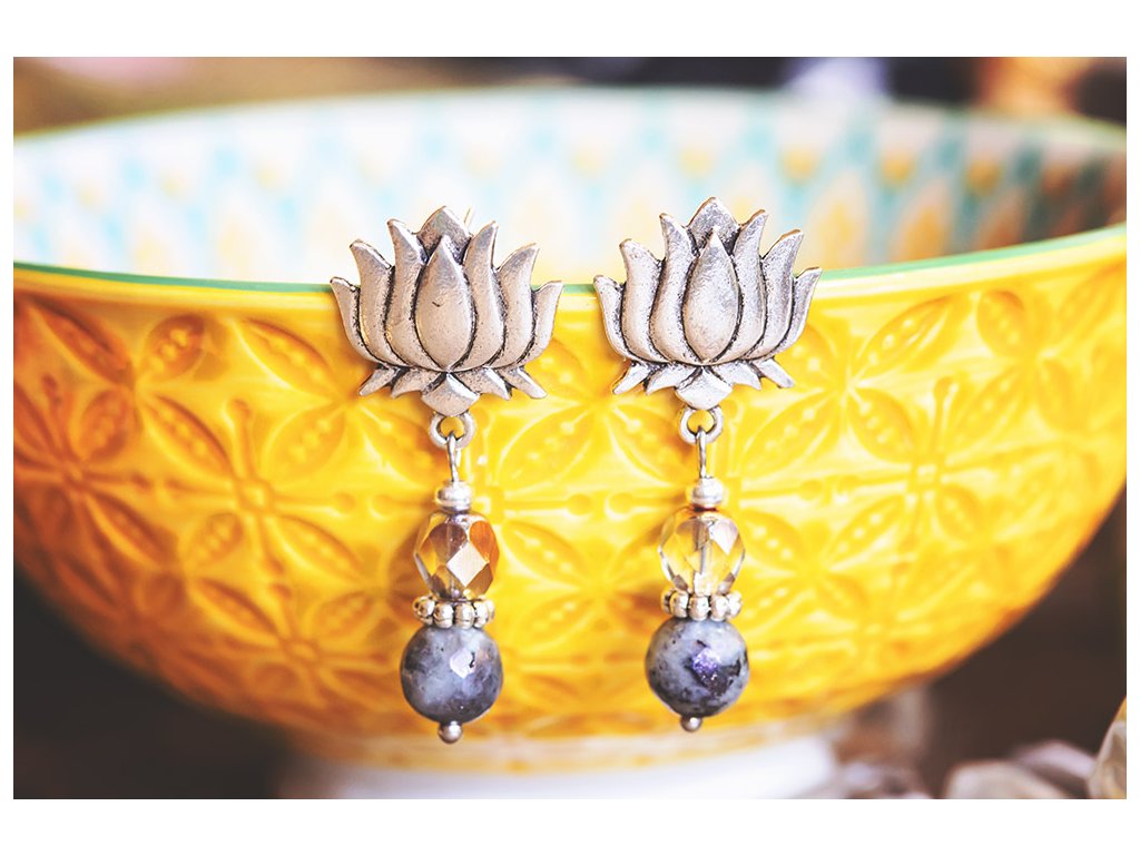 Náušnice lotosy s labradoritem Náušnice lotosy s fasetováními labradority s duhovou povrchovou úpravou a jabloneckými korálky. Materiál bronz zdobený alpakou. S lotosem se často setkáváme v prastarých kulturách různých národů. Je symbolem znovuzrození, krásy, života, štěstí, čistoty a duchovnosti, jednoty mikro a makrokosmu, symbolem rovnováhy mužského a ženského počátku. Lotosový květ napomáhá zrození harmonie a lásky uvnitř nás. Labradorit je vhodný pro bytost, která je připravená ukázat světu své skryté hlubiny. Vynáší na povrch to, co před světem ukrýváme a osvobozuje naši osobnost od starých vzorců a zábran. Odložením zábran se navrací do života spontánnost a radost. Je to také ochranný kámen šamanů a mágů, aby nesešli z cesty při propojování různých dimenzí a světů, přináší světlo, které rozjasňuje tuto cestu. Délka: 42 mm Hmotnost jedné náušnice: 3 gDoplňkové parametry