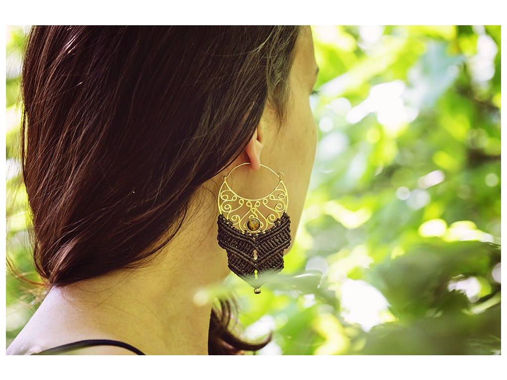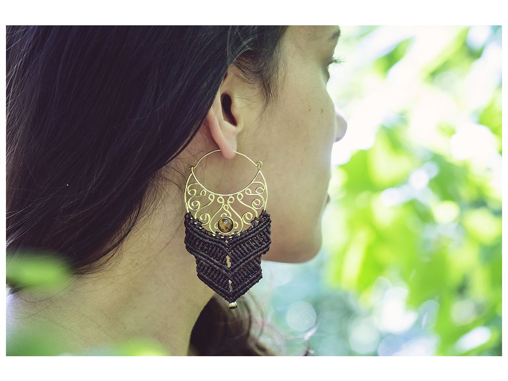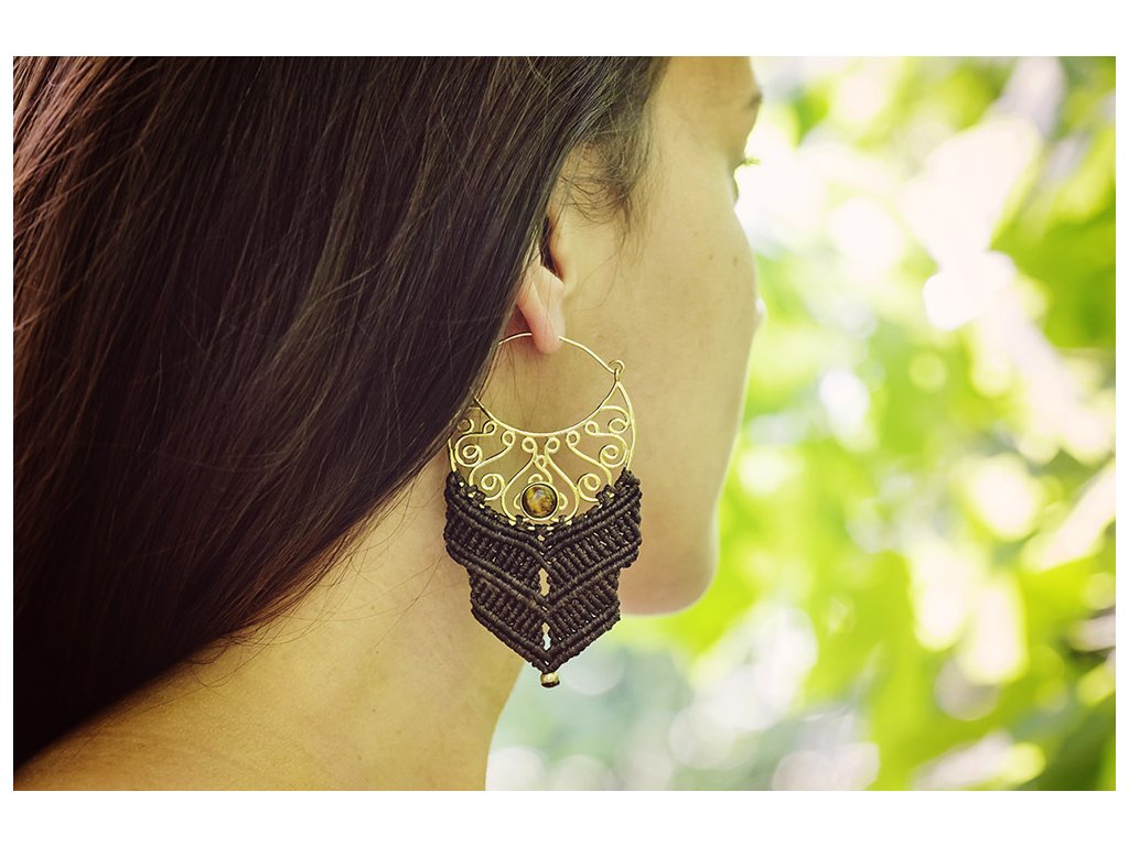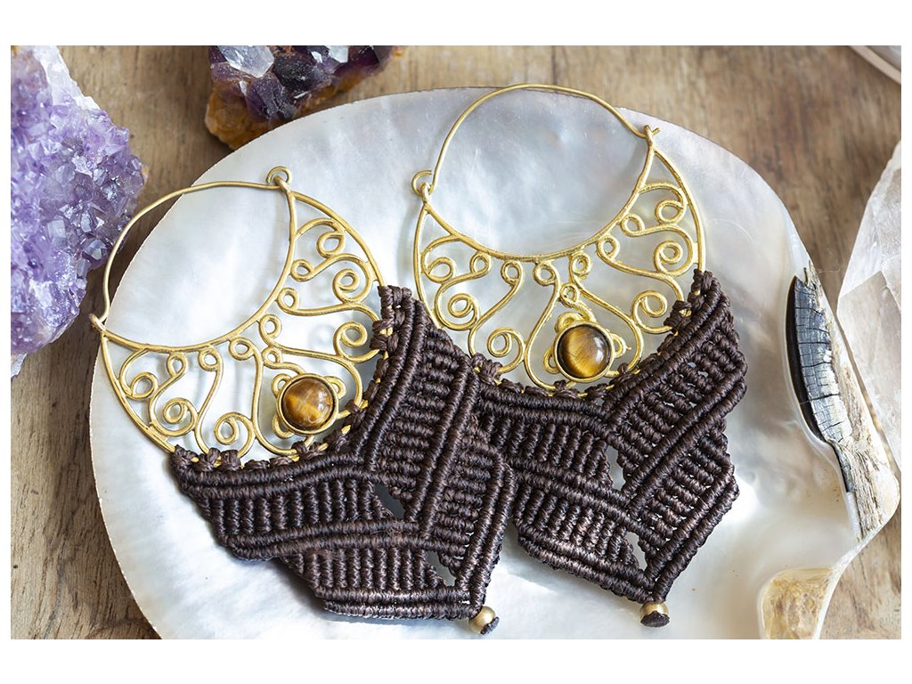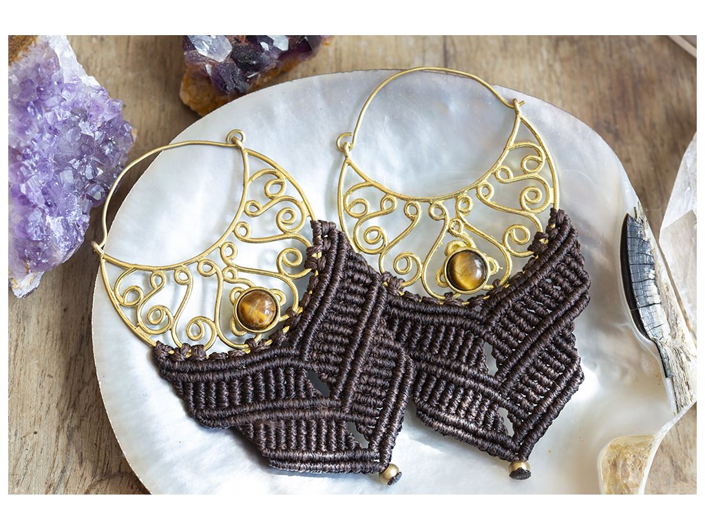 Náušnice macramé s tygřím okem Krásné macramé náušnice s tygřím okem zasazeným v mosazi Každý šperk macramé je originální jedinečný ručně vyrobený kus. Tygří oko je ochranný kámen, který se používá jako talisman před všemi formami nebezpečí. Propojuje sluneční a zemskou energii a tím pomáhá uzemnit lidi, kteří ztratili spojení s realitou a zároveň podporuje duchovní růst těch materialisticky zaměřených. Je to hřejivý kámen, podporuje tok energie v těle a dodává sílu, přitahuje peníze a prosperitu. Pomáhá s odbouráním závislostí na druhých uznáním vlastní hodnoty. Mírní deprese.. Rozměry: Délka cca 87 mm, šířka cca 47 mm Hmotnost jedné náušnice: 11 gDoplňkové parametry