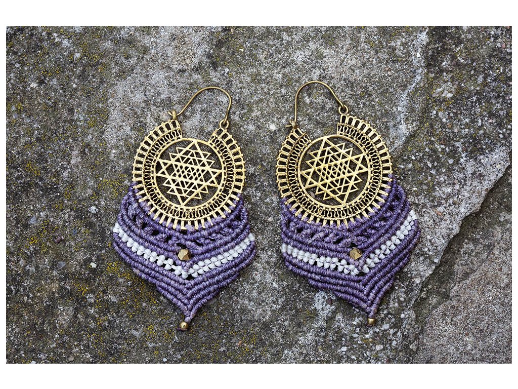 Náušnice macramé se šrí jantrou Krásné náušnice z mosazi a macramé se symbolem šrí jantra. Každý šperk macramé je originální jedinečný ručně vyrobený kus. Symbol Šrí jantra představuje univerzální lásku, božskou harmonii, moudrost a mír. Funguje jako ochrana před negativními energiemi, napomáhá k udržení fyzického i psychického zdraví. Posiluje sebeovládání, vytrvalost a klid, usměrňuje city a tužby. Rozměry: Délka cca 6,5 cm Hmotnost jedné náušnice: 11 gDoplňkové parametry