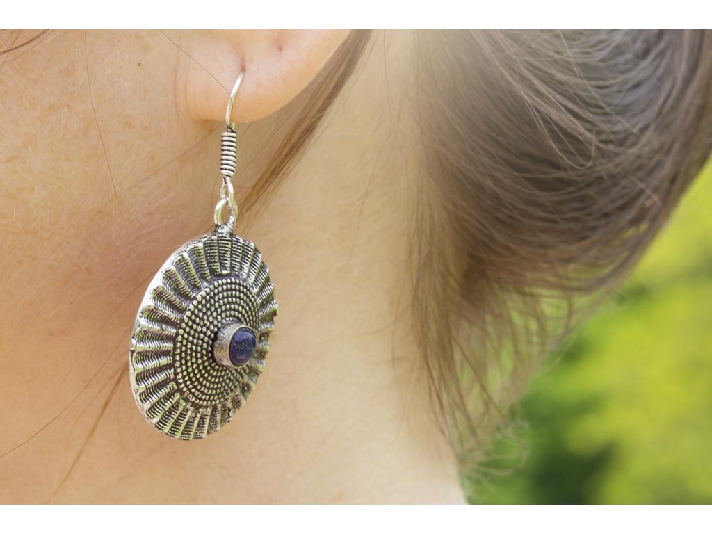 Náušnice mandaly s drahokamem Náušnice mandaly s drahokamem uprostřed. Jsou vyrobené z alpaky. Drahokam na výběr: ametyst, měsíční kámen, labradorit, lapis lazuli. Ametyst je kamenem čistoty ducha a meditace. Pomáhá nám v sobě objevovat sebeobětování, lásku, pokoru a nezištnost. Těmito vlastnostmi nám otevírá cestu do jiných dimenzí bytí. Je to kámen inspirace, směřuje naše myšlení k tvořivé práci a probouzí v nás intuici. Měsíční kámen je uchvacující drahokam, který má silné magické účinky. Ochraňuje citlivé povahy a napomáhá vyrovnaným šťastným vztahům, je považován za drahokam štěstí. Stejně tak působí na intuici, tvořivost a podpoří Vás v nových začátcích. Šperk s měsíčním kamenem by neměl chybět ve šperkovnici žádné ženy. Více o měsíčním kameni se dočtete na našem blogu. Lapis lazuli je jedinečný drahokam, který pomáhá a podporuje svého nositele v mnoha ohledech. Navozuje vnitřní klid a mír, podporuje radost, odvahu, lásku, poctivost a kreativitu. Upevňuje mezilidské vztahy a zlepšuje komunikaci. Zvyšuje sebevědomí a podporuje osobní růst. Mírní strach, vztek a agresivitu. Má blahodárný vliv na paměť a úsudek. Dokáže odstraňovat stres a taky být velkým pomocníkem při detoxikaci organismu, například při dietě. Průměr cca 3,2 cm. Hmotnost jedné náušnice cca 7 gBuďte první, kdo napíše příspěvek k této položce.