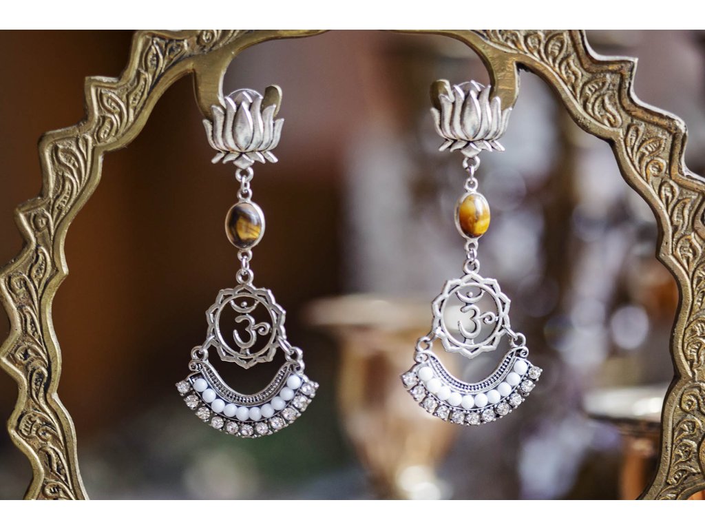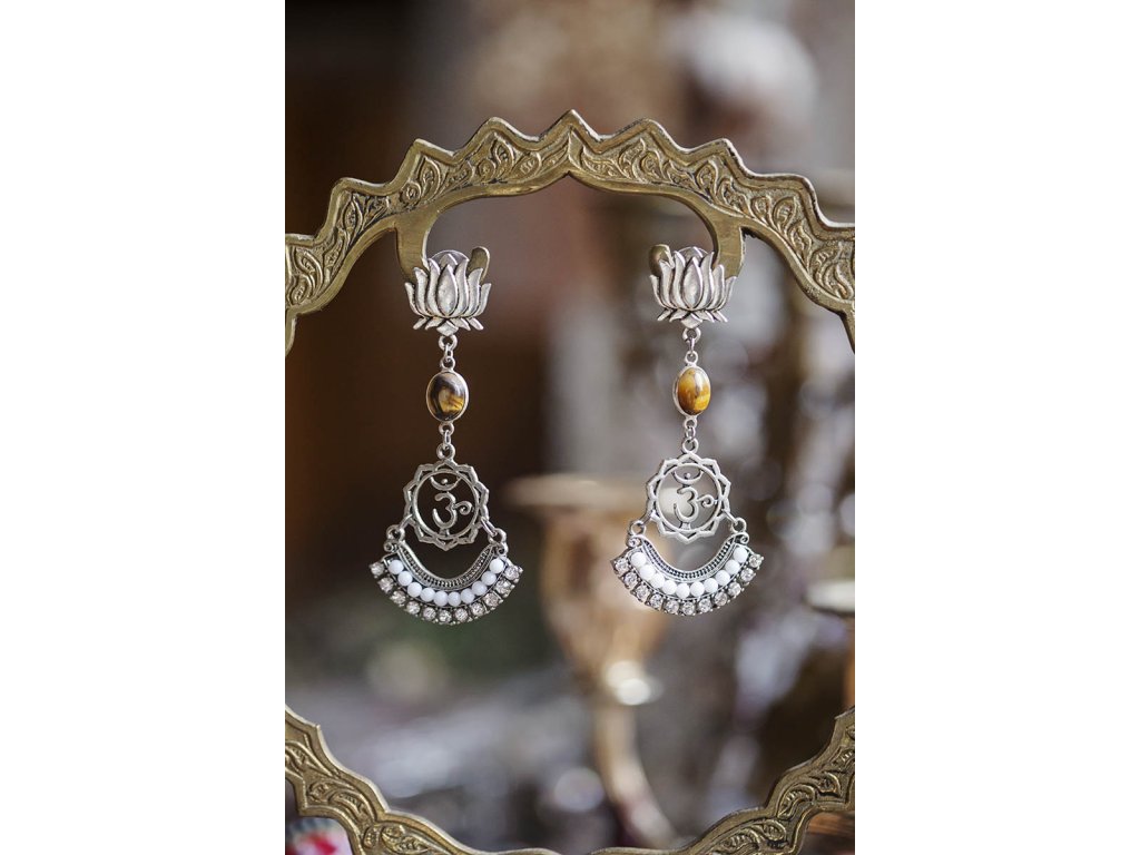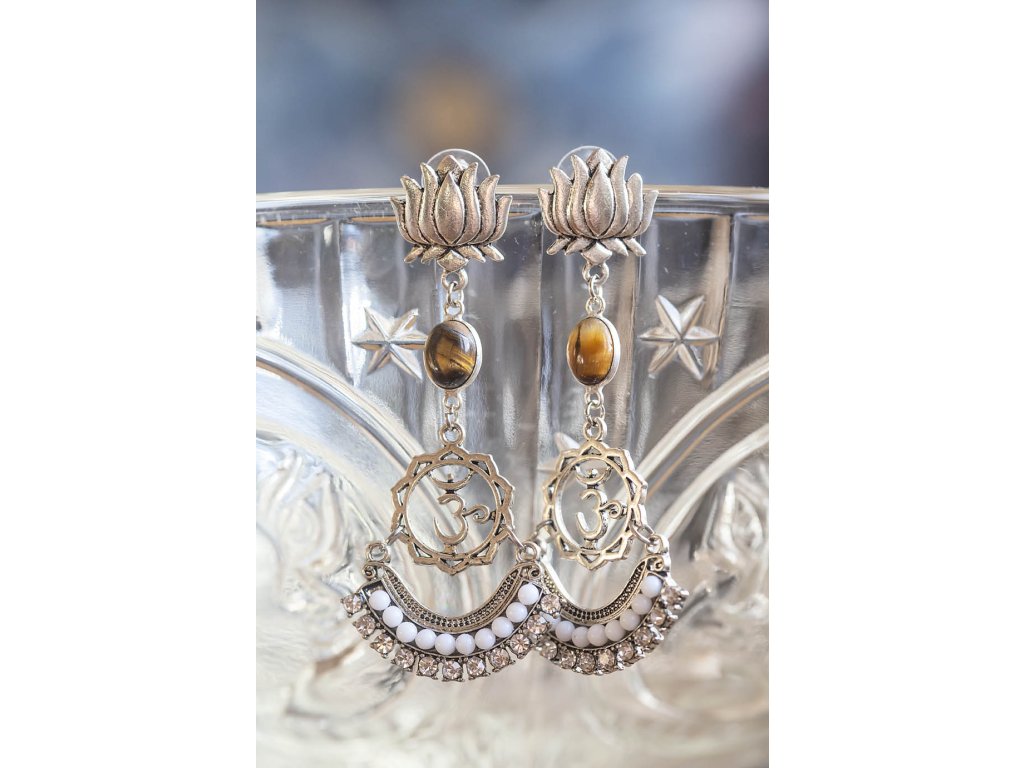 Náušnice óm s lotosy Představujeme vám náušnice óm s lotosy. Ôm je univerzální zvuk vesmíru hojící a harmonizující vše živé i neživé. Je kořenem vyživujícím krásu lotosu nad kameny tygřího oka, hřejivě opalizujícího kamene pro naše uzemnění a klid v duši. Trash art jedinečné kousky, recyklované z vintage bižuterie a krásných komponent dovezených z Indie. Tygří oko je ochranný kámen, která se používá jako talisman před všemi formami nebezpečí. Propojuje sluneční a zemskou energii a tím pomáhá uzemnit lidi, kteří ztratili spojení s realitou a zároveň podporuje duchovní růst těch materialisticky zaměřených. Je to hřejivý kámen, podporuje to energie v těle a dodává sílu, přitahuje peníze a prosperitu. Pomáhá s odbouráním závislostí na druhých uznáním vlastní hodnoty. Mírní deprese. S lotosem se často setkáváme v prastarých kulturách různých národů. Je symbolem znovuzrození, krásy, života, štěstí, čistoty a duchovnosti, jednoty mikro a makrokosmu, symbolem rovnováhy mužského a ženského počátku. Lotosový květ napomáhá zrození harmonie a lásky uvnitř nás. Óm je prastará mantra, která se často zpívá při jogínských cvičeních. Óm je ale i symbol, který má náboženský význam a hloubku. Je to zvuk stvoření vesmíru i zvuk ticha. Představuje nejvyšší božskou úroveň a cestu l osvícení. Symbol napomáhá ke zklidnění mysli, vytvoření pokojného prostředí a dosažení vyšší úrovně vědomí. Délka cca 8 cm Hmotnost jedné náušnice cca 9 gDoplňkové parametry
