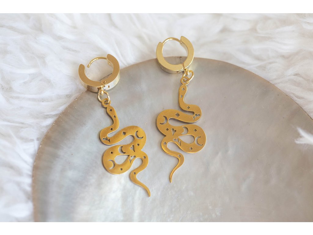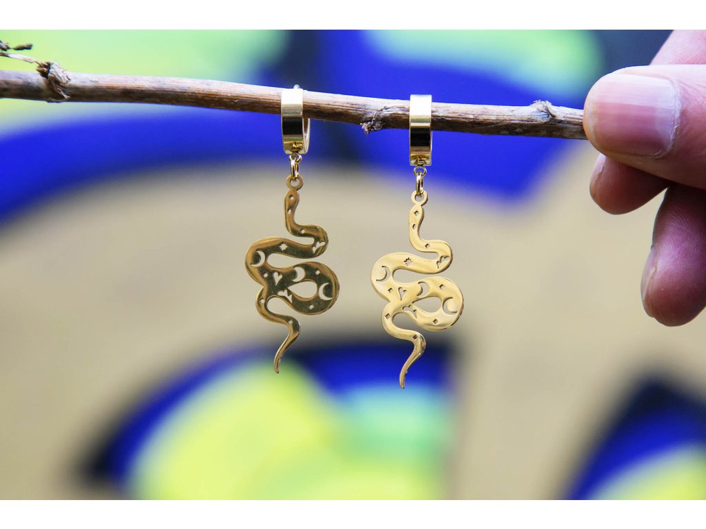 Náušnice posvátní hadi Náušnice posvátní hadi z nerezové oceli ve zlaté barvě jsou pro podporu kundaliní energie a jsou skvělým dárkem pro jogínku. Neváhejte máme jen jeden kousek! Délka i se závěsem cca 5 cm Hmotnost jedné náušnice cca 3 gDoplňkové parametry