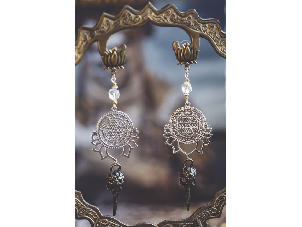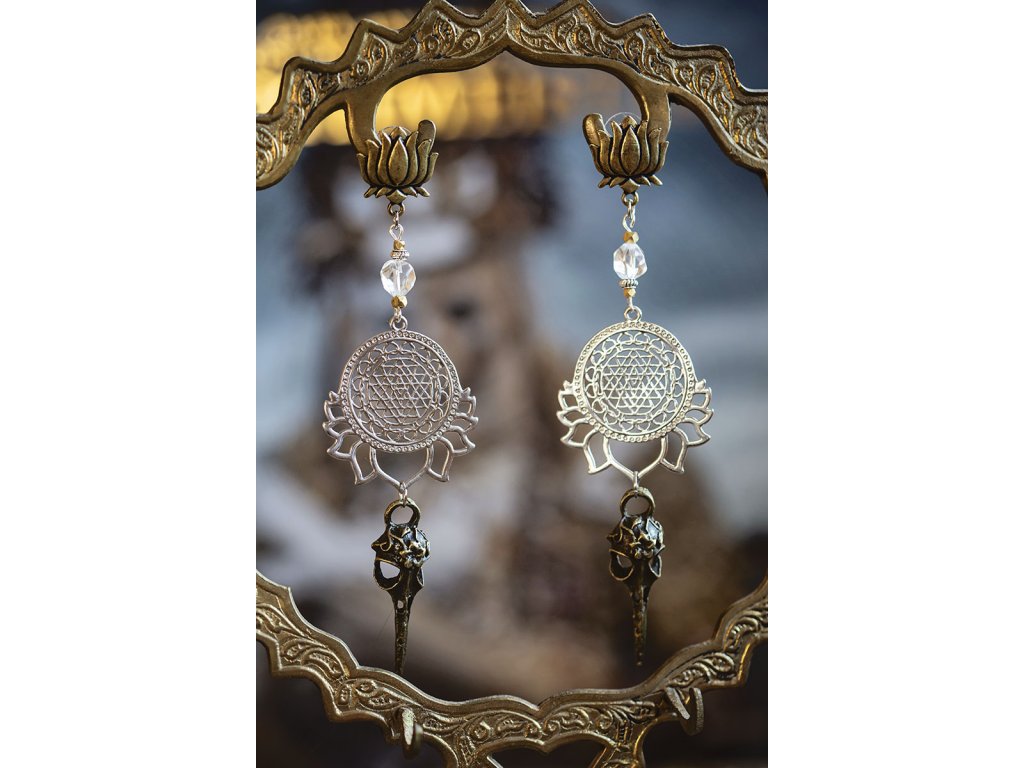Náušnice Prema Kubicky fasetované křišťály, lotosové květy, šrí jantra a mosazné ptačí lebky. Tyto náušnice jsou Prema jsou pro čarodějku nebo každou ženu, která chce kromě krásy i podporu mocných symbolů. Toto je jediný trash art ručně zpracovaný unikát, druhé takové nebudou, tak neváhejte! Křišťál je jedinečný kámen, který uvádí energii svého nositele do harmonie, zesiluje jí a tím povzbuzuje psychiku, jasnozřivost a samostatnost a sebezdokonalení. Ochraňuje před zlými a negativními silami. Harmonizuje, čistí a chrání auru a tím zajišťuje klidný spánek. Je vhodný pro meditace a magické účely. S lotosem se často setkáváme v prastarých kulturách různých národů. Je symbolem znovuzrození, krásy, života, štěstí, čistoty a duchovnosti, jednoty mikro a makrokosmu, symbolem rovnováhy mužského a ženského počátku. Lotosový květ napomáhá zrození harmonie a lásky uvnitř nás. Symbol Šrí jantra představuje univerzální lásku, božskou harmonii, moudrost a mír. Funguje jako ochrana před negativními energiemi, napomáhá k udržení fyzického i psychického zdraví. Posiluje sebeovládání, vytrvalost a klid, usměrňuje city a tužby. Délka cca 12 cm Hmotnost jedné náušnice cca 13 gDoplňkové parametry
