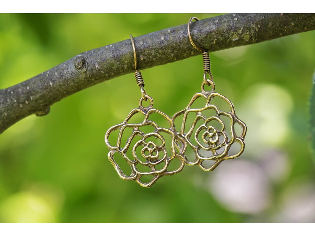 Náušnice růže Mosazné náušnice ve tvaru květu růže. délka cca 4,5 cm Hmotnost jedné náušnice cca 2 g
