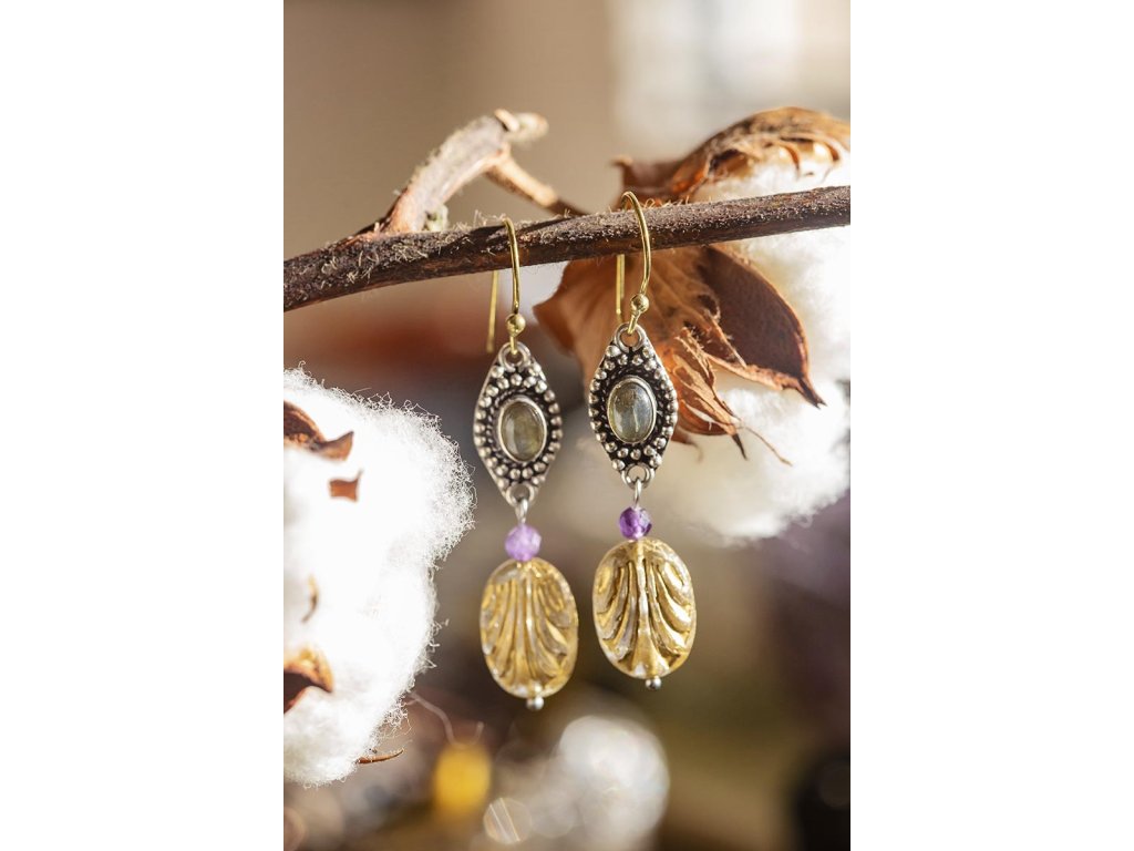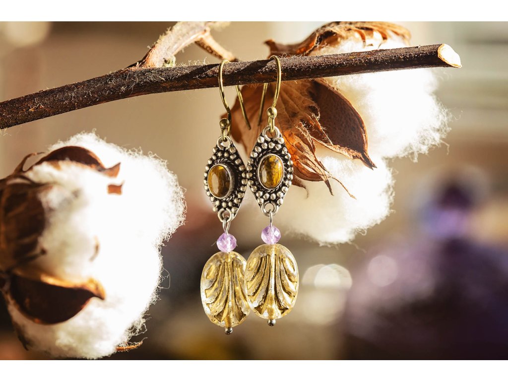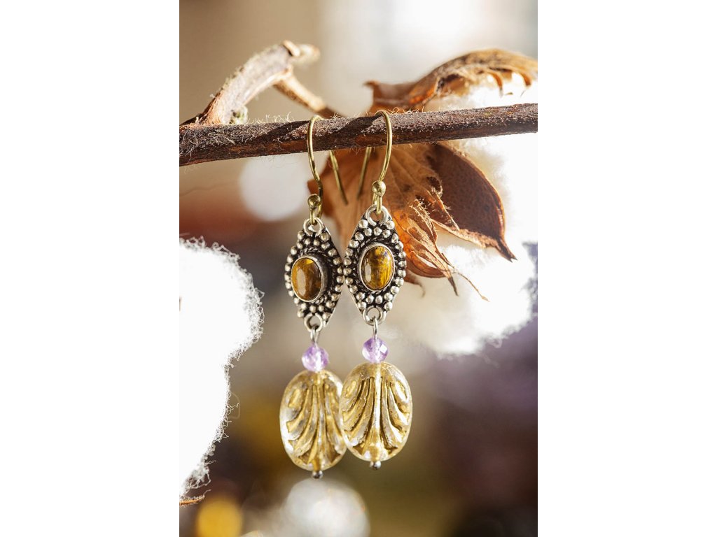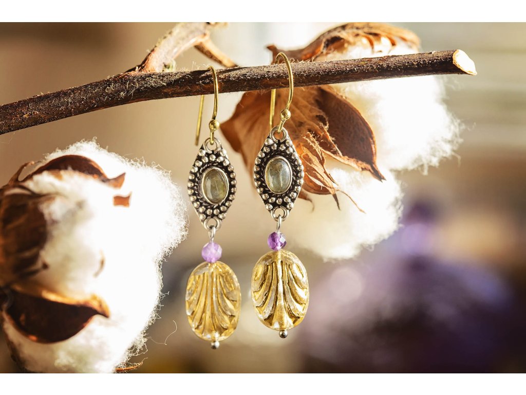 Náušnice s drahokamem Překrásné náušnice s drahokamem zasazeným do bílého kovu, fasetovaným ametystem a korálek od českých sklářů. Mají starožitný vzhled. Na výběr bílý měsíční kámen, fialový ametyst, zlatozelený labradorit a žlutohnědé tygří oko. Ametyst je kamenem čistoty ducha a meditace. Pomáhá nám v sobě objevovat sebeobětování, lásku, pokoru a nezištnost. Těmito vlastnostmi nám otevírá cestu do jiných dimenzí bytí. Je to kámen inspirace, směřuje naše myšlení k tvořivé práci a probouzí v nás intuici. Labradorit je vhodný pro bytost, která je připravená ukázat světu své skryté hlubiny. Vynáší na povrch to, co před světem ukrýváme a osvobozuje naši osobnost od starých vzorců a zábran. Odložením zábran se navrací do života spontánnost a radost. Je to také ochranný kámen šamanů a mágů, aby nesešli z cesty při propojování různých dimenzí a světů, přináší světlo, které rozjasňuje tuto cestu. Měsíční kámen je uchvacující drahokam, který má silné magické účinky. Ochraňuje citlivé povahy a napomáhá vyrovnaným šťastným vztahům. Je považován za drahokam štěstí. Působí pozitivně na intuici, tvořivost a podpoří Vás v nových začátcích. Šperk s měsíčním kamenem by neměl chybět ve šperkovnici žádné ženy. Více o měsíčním kameni se dočtete na našem blogu. Tygří oko je ochranný kámen, která se používá jako talisman před všemi formami nebezpečí. Propojuje sluneční a zemskou energii a tím pomáhá uzemnit lidi, kteří ztratili spojení s realitou a zároveň podporuje duchovní růst těch materialisticky zaměřených. Je to hřejivý kámen, podporuje to energie v těle a dodává sílu, přitahuje peníze a prosperitu. Pomáhá s odbouráním závislostí na druhých uznáním vlastní hodnoty. Mírní deprese. Délka cca 5,5 cm Hmotnost jedné náušnice cca 4 gBuďte první, kdo napíše příspěvek k této položce.