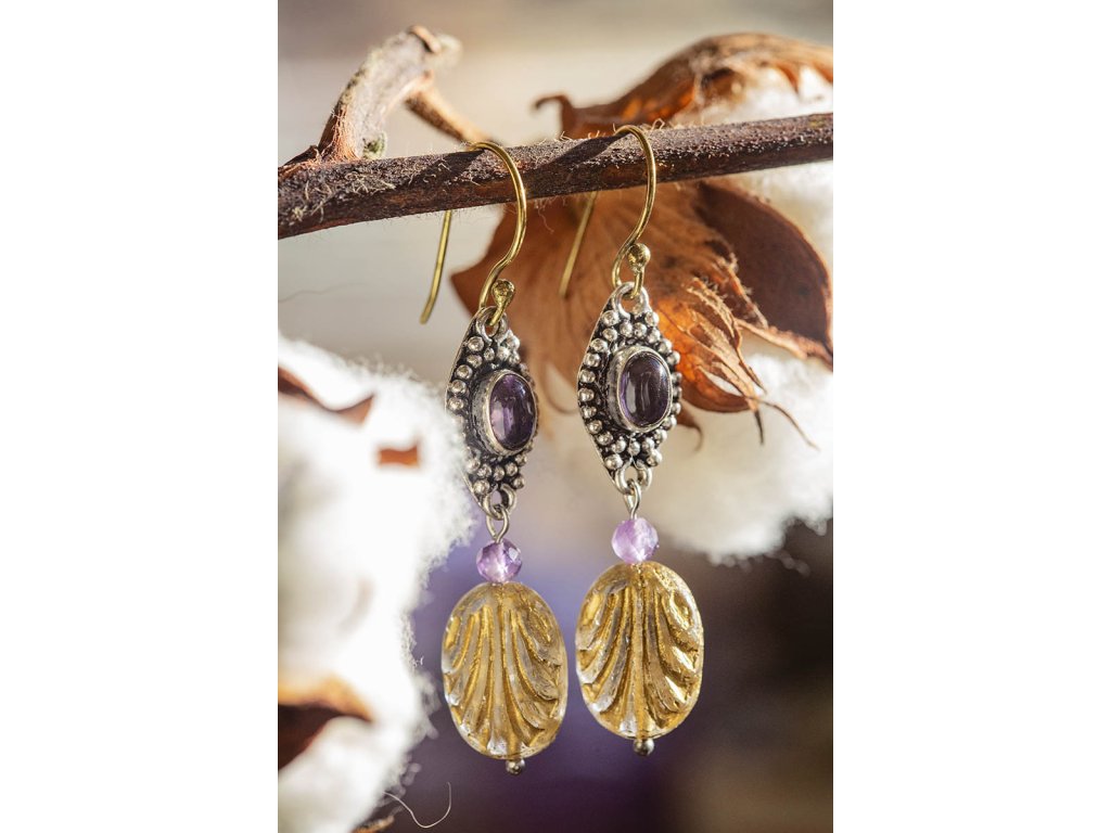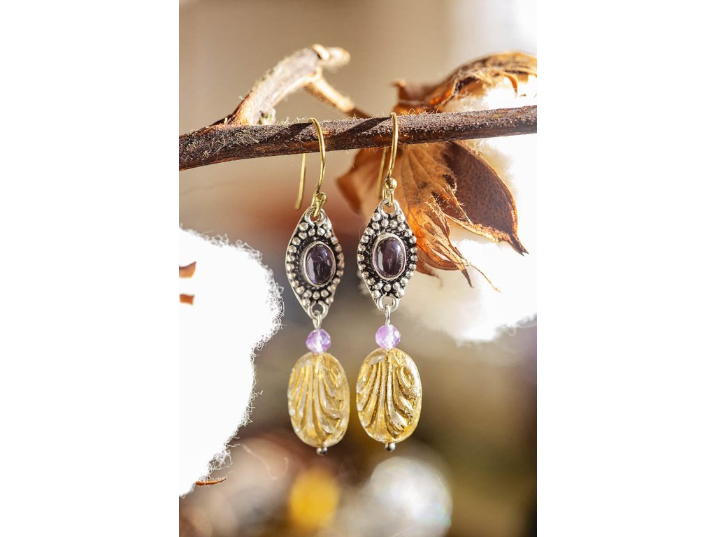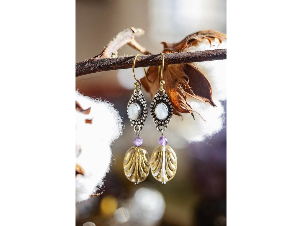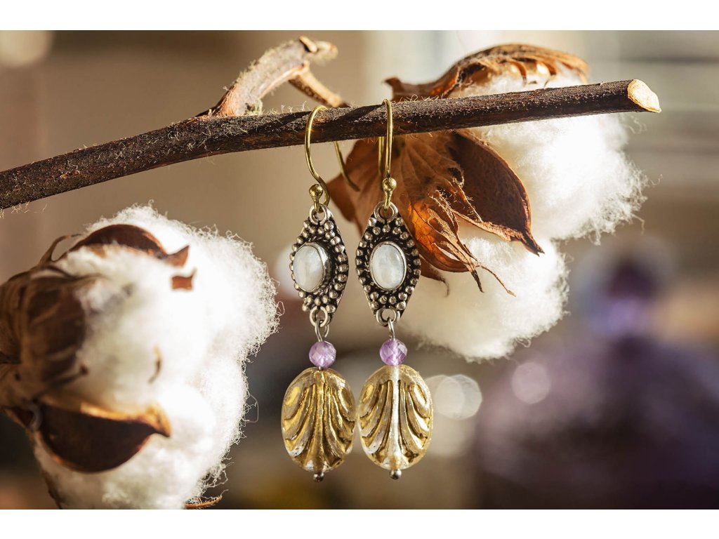 Náušnice s drahokamem Překrásné náušnice s drahokamem zasazeným do bílého kovu, fasetovaným ametystem a korálek od českých sklářů. Mají starožitný vzhled. Na výběr bílý měsíční kámen, fialový ametyst, zlatozelený labradorit a žlutohnědé tygří oko. Ametyst je kamenem čistoty ducha a meditace. Pomáhá nám v sobě objevovat sebeobětování, lásku, pokoru a nezištnost. Těmito vlastnostmi nám otevírá cestu do jiných dimenzí bytí. Je to kámen inspirace, směřuje naše myšlení k tvořivé práci a probouzí v nás intuici. Labradorit je vhodný pro bytost, která je připravená ukázat světu své skryté hlubiny. Vynáší na povrch to, co před světem ukrýváme a osvobozuje naši osobnost od starých vzorců a zábran. Odložením zábran se navrací do života spontánnost a radost. Je to také ochranný kámen šamanů a mágů, aby nesešli z cesty při propojování různých dimenzí a světů, přináší světlo, které rozjasňuje tuto cestu. Měsíční kámen je uchvacující drahokam, který má silné magické účinky. Ochraňuje citlivé povahy a napomáhá vyrovnaným šťastným vztahům. Je považován za drahokam štěstí. Působí pozitivně na intuici, tvořivost a podpoří Vás v nových začátcích. Šperk s měsíčním kamenem by neměl chybět ve šperkovnici žádné ženy. Více o měsíčním kameni se dočtete na našem blogu. Tygří oko je ochranný kámen, která se používá jako talisman před všemi formami nebezpečí. Propojuje sluneční a zemskou energii a tím pomáhá uzemnit lidi, kteří ztratili spojení s realitou a zároveň podporuje duchovní růst těch materialisticky zaměřených. Je to hřejivý kámen, podporuje to energie v těle a dodává sílu, přitahuje peníze a prosperitu. Pomáhá s odbouráním závislostí na druhých uznáním vlastní hodnoty. Mírní deprese. Délka cca 5,5 cm Hmotnost jedné náušnice cca 4 gBuďte první, kdo napíše příspěvek k této položce.