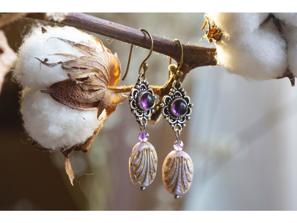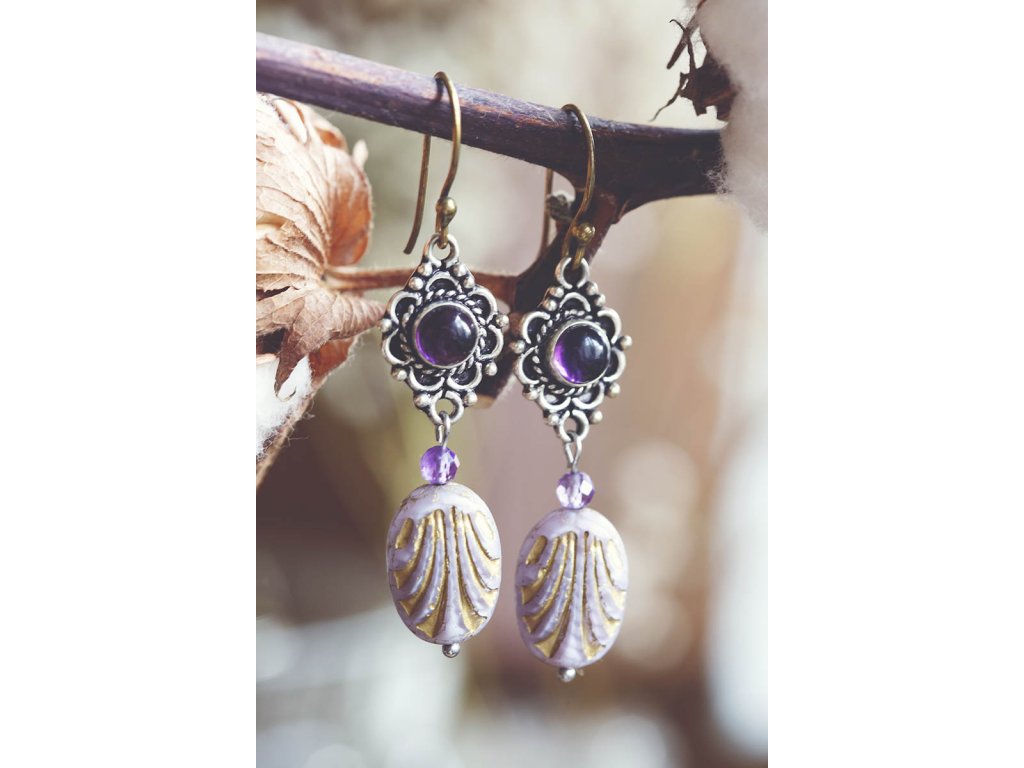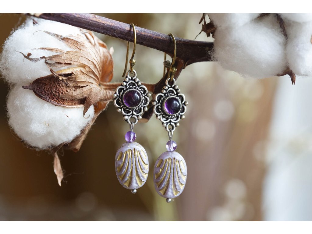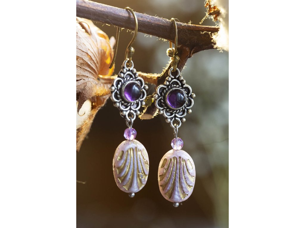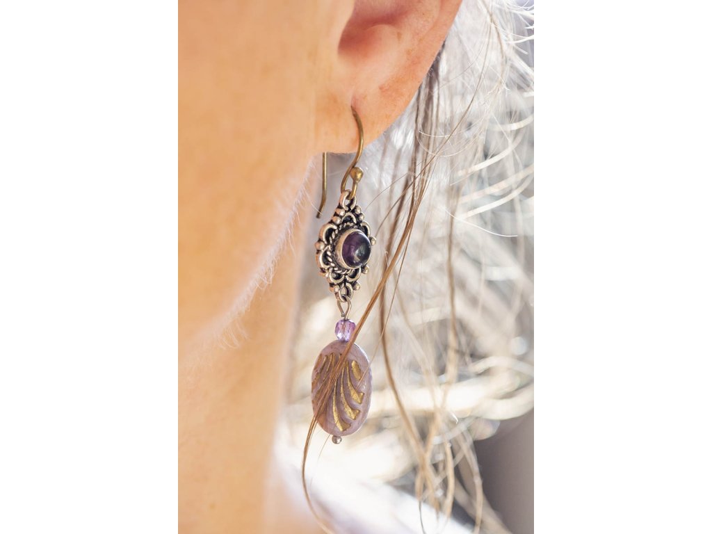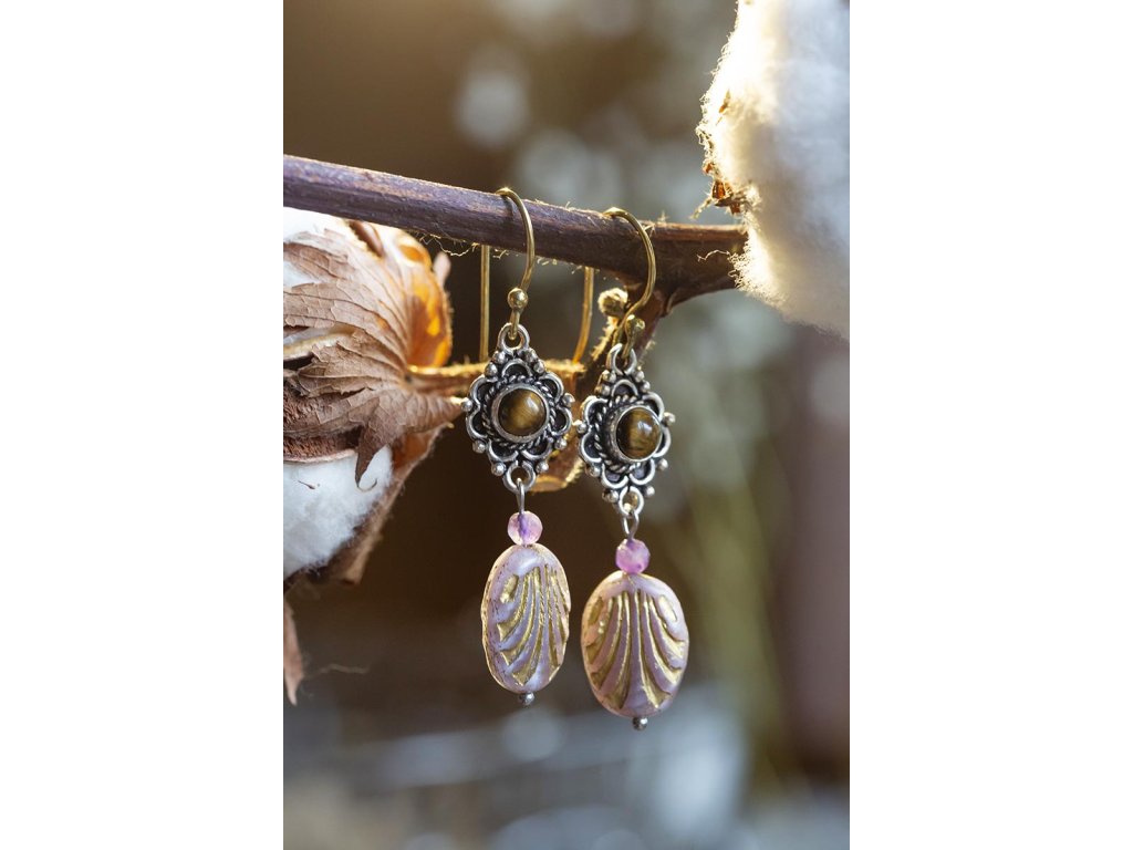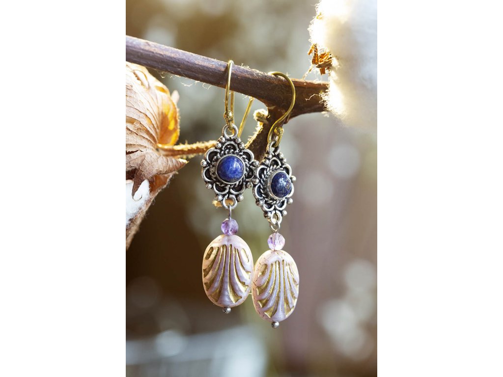 Náušnice s drahokamem Kulatý drahokam zasazený do zdobeného okruží, malý broušený ametyst a designový korálkem od českých sklářů - to jsou tyto krásné náušnice, která vás ozdobí pro každou příležitost. Na výběr je tmavě modrý lapis lazuli, fialový ametyst a žlutohnědé tygří oko. Ametyst je kamenem čistoty ducha a meditace. Pomáhá nám v sobě objevovat sebeobětování, lásku, pokoru a nezištnost. Těmito vlastnostmi nám otevírá cestu do jiných dimenzí bytí. Je to kámen inspirace, směřuje naše myšlení k tvořivé práci a probouzí v nás intuici. Lapis lazuli je jedinečný drahokam, který pomáhá a podporuje svého nositele v mnoha ohledech. Navozuje vnitřní klid a mír, podporuje radost, odvahu, lásku, poctivost a kreativitu. Upevňuje mezilidské vztahy a zlepšuje komunikaci. Zvyšuje sebevědomí a podporuje osobní růst. Mírní strach, vztek a agresivitu. Má blahodárný vliv na paměť a úsudek. Dokáže odstraňovat stres a taky být velkým pomocníkem při detoxikaci organismu, například při dietě. Měsíční kámen je uchvacující drahokam, který má silné magické účinky. Ochraňuje citlivé povahy a napomáhá vyrovnaným šťastným vztahům. Je považován za drahokam štěstí. Působí pozitivně na intuici, tvořivost a podpoří Vás v nových začátcích. Šperk s měsíčním kamenem by neměl chybět ve šperkovnici žádné ženy. Více o měsíčním kameni se dočtete na našem blogu. Tygří oko je ochranný kámen, která se používá jako talisman před všemi formami nebezpečí. Propojuje sluneční a zemskou energii a tím pomáhá uzemnit lidi, kteří ztratili spojení s realitou a zároveň podporuje duchovní růst těch materialisticky zaměřených. Je to hřejivý kámen, podporuje to energie v těle a dodává sílu, přitahuje peníze a prosperitu. Pomáhá s odbouráním závislostí na druhých uznáním vlastní hodnoty. Mírní deprese. Délka cca 5,5 cm Hmotnost jedné náušnice cca 4 gBuďte první, kdo napíše příspěvek k této položce.