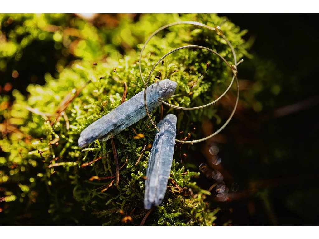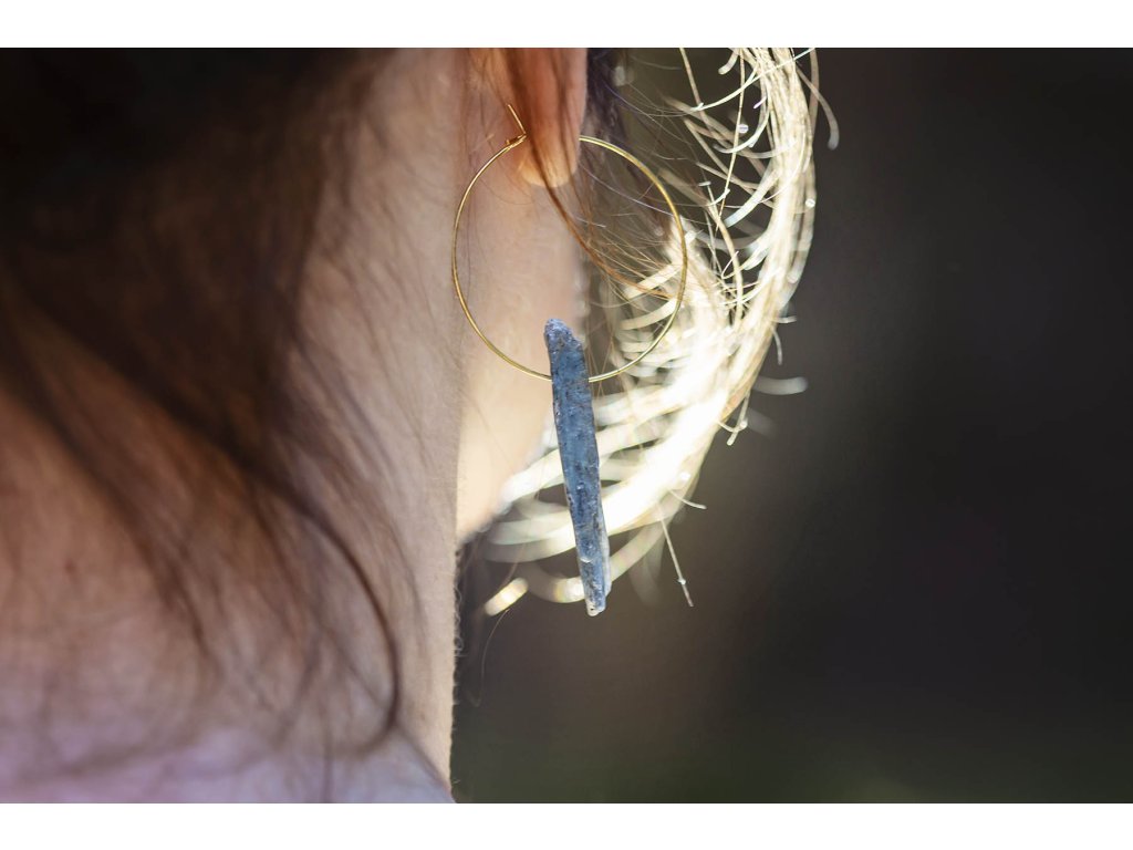 Náušnice s kyanitem Divotvorný tajemný kyanit s tenkým mosazným kroužkem. Tyto náušnice s kyanitem musíte mít. Jsou originální a velmi elegantní. Kyanit je nesmírně uklidňující kámen, který nás dokáže podpořit ve stresových situacích, ochrání před negativními energiemi a napomáhá soustředění při dosažení cíle. Je spojován s krční čakrou, tudíž podporuje i naši komunikaci a napomáhá zlepšovat mezilidské vztahy. Je důležitým pomocníkem pro zklidnění a meditaci. Posiluje naši intuici a vede nás k pravdě. Další náušnice s kyanitem najdete zde. Průměr kroužku cca 3,5 cm Hmotnost jedné náušnice cca 3 gDoplňkové parametry