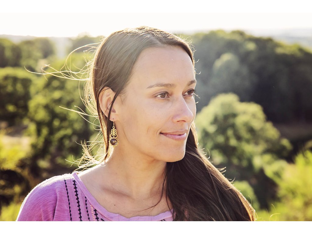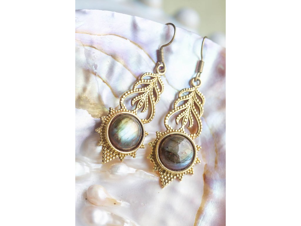 Náušnice s labradoritem Jedinečné krásné mosazné náušnice s velkým labradoritem vydávajícím zeleno zlatavé záblesky. Labradorit je vhodný pro bytost, která je připravená ukázat světu své skryté hlubiny. Vynáší na povrch to, co před světem ukrýváme a osvobozuje naši osobnost od starých vzorců a zábran. Odložením zábran se navrací do života spontánnost a radost. Je to také ochranný kámen šamanů a mágů, aby nesešli z cesty při propojování různých dimenzí a světů, přináší světlo, které rozjasňuje tuto cestu. Délka i se závěsem cca 5 cm Hmotnost jedné náušnice cca 6 gDoplňkové parametry
