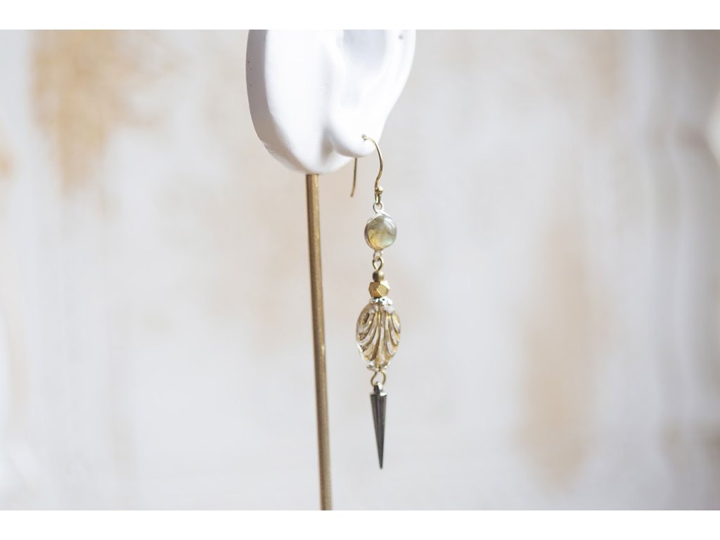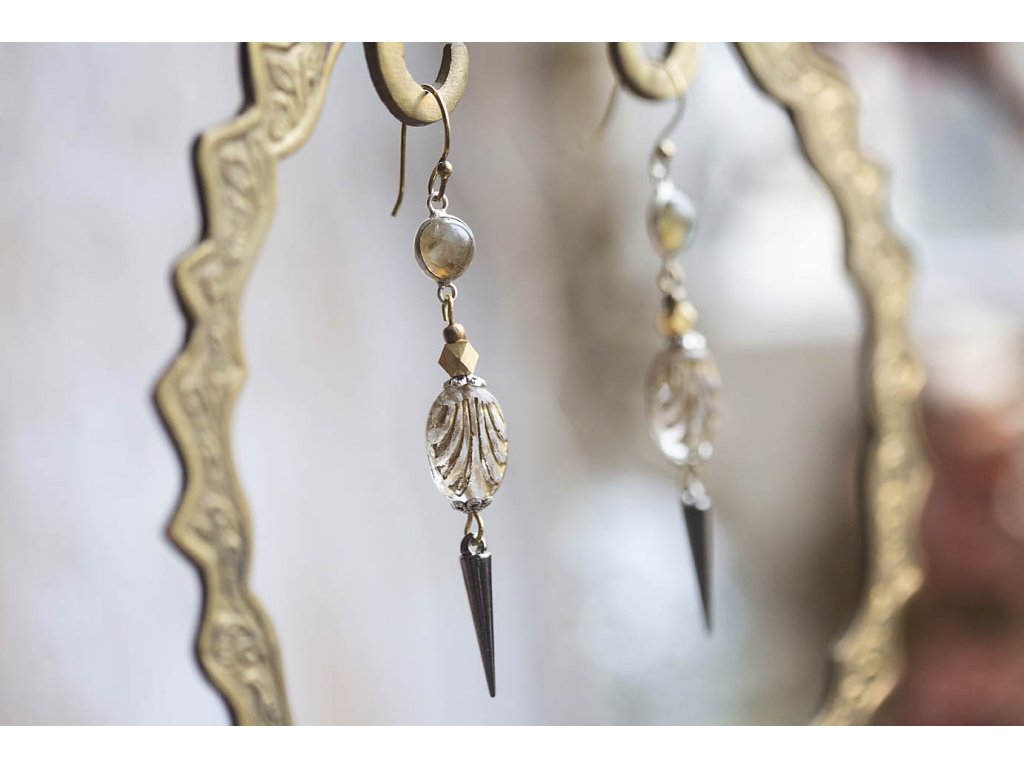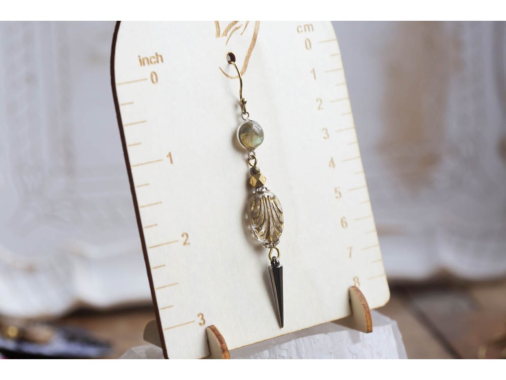 Náušnice s labradoritem Tyto náušnice s labradoritem ve stylu ezopunku jsou složením komponent z dálné Indie i z české sklárny. Krásné labradority jsou zasazeny v postříbřené mosazi a společnost jim tvoří krásné oválky strukturované tak, že připomínají mušle. Šperk je dotvořen pomocí dvou mosazných korálků, jednoho většího fazetovaného, který spolu s recyklovnou komponentou - ostnem - dodávají náušnicím punkový feeling. Náušnice jsou úžasně lehounké a krásně se mihotají při divokém tanci.Doplňkové parametry