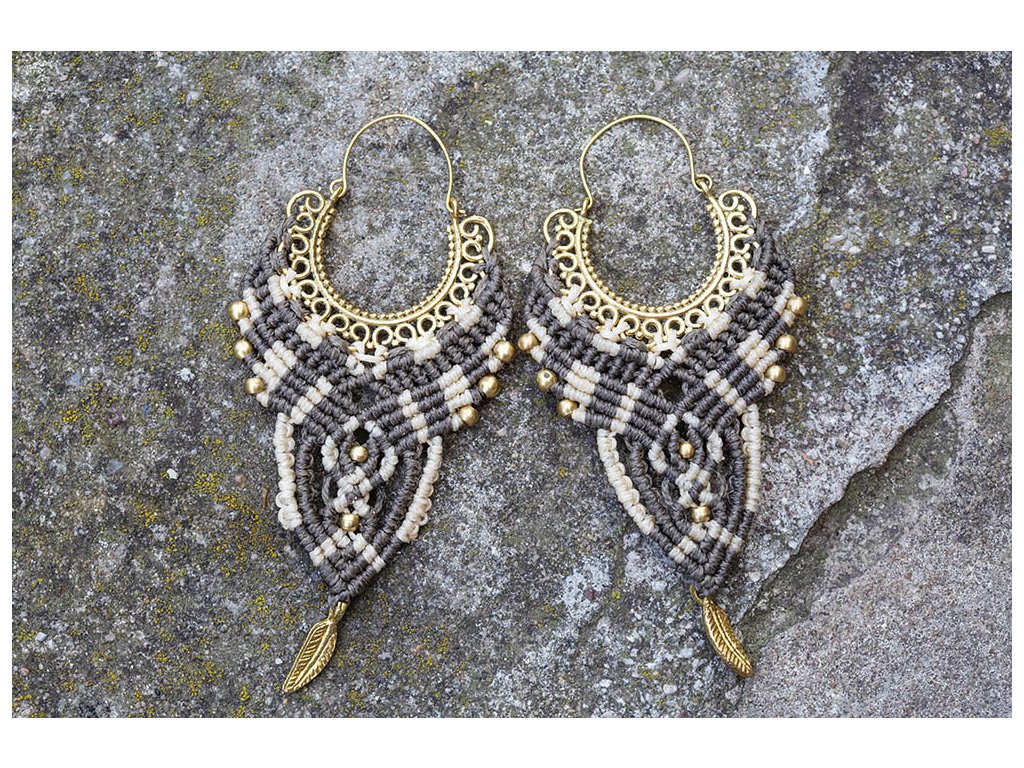 Náušnice s macramé s pírkem Krásné náušnice s mosaznou zdobnou částí, zakončené pírkem. Každý šperk macramé je originální jedinečný ručně vyrobený kus. Rozměry: Délka cca 9 cm Hmotnost jedné náušnice: 9 gDoplňkové parametry