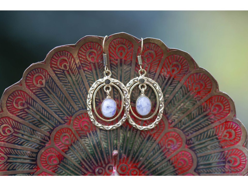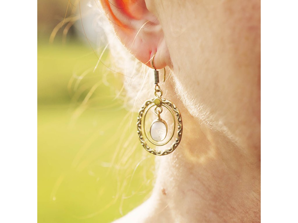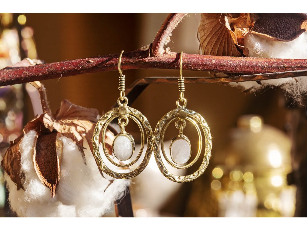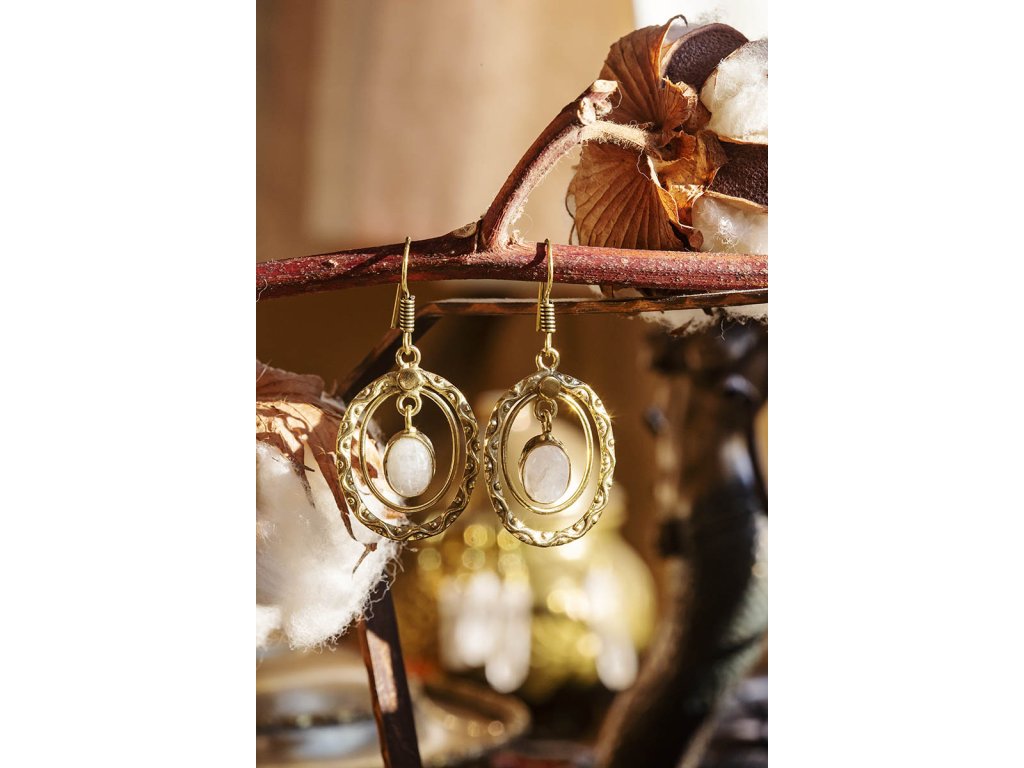 Náušnice s měsíčním kamenem Mosazné náušnice dva ovály uprostřed s měsíčním kamenem. Měsíční kámen je uchvacující drahokam, který má silné magické účinky. Ochraňuje citlivé povahy a napomáhá vyrovnaným šťastným vztahům. Je považován za drahokam štěstí. Působí pozitivně na intuici, tvořivost a podpoří Vás v nových začátcích. Šperk s měsíčním kamenem by neměl chybět ve šperkovnici žádné ženy. Více o měsíčním kameni se dočtete na našem blogu. Délka cca 4,5 cm Hmotnost jedné náušnice cca 4 gDoplňkové parametry