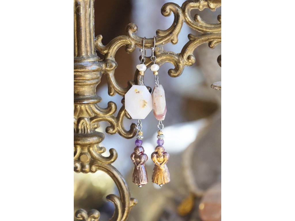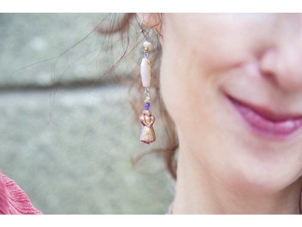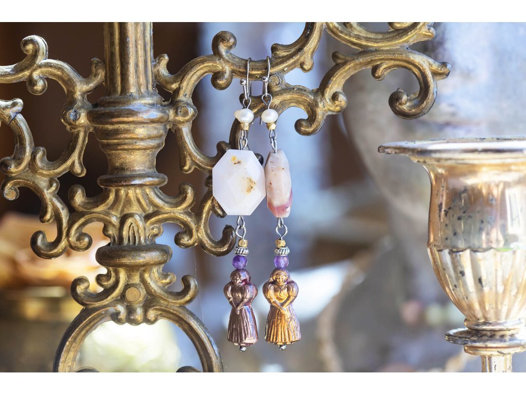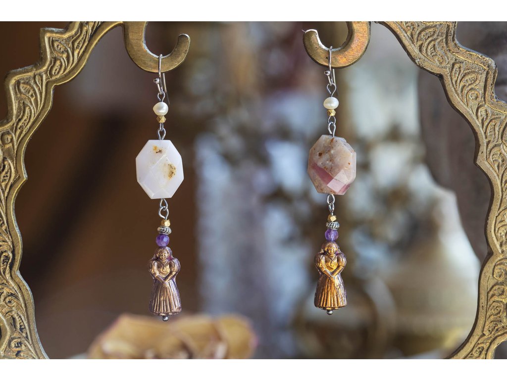 Náušnice s opály Tyto náušnice s ochrannými panenkami skleněnkami, fasetovanými ametysty, říčními perličkami a velkými opály v přírodních narůžovělých tónech, jsou originální ozdobou a zamilujete si je. Ametyst je kamenem čistoty ducha a meditace. Pomáhá nám v sobě objevovat sebeobětování, lásku, pokoru a nezištnost. Těmito vlastnostmi nám otevírá cestu do jiných dimenzí bytí. Je to kámen inspirace, směřuje naše myšlení k tvořivé práci a probouzí v nás intuici. Více o ametystu se dočtete na našem blogu. Opál je vzácný nádherný kámen. V jakémkoliv šperku upoutává pozornost. Podporuje intuici, harmonizuje organizmus, zmírňuje deprese. S nesmírnou silou neutralizuje všechny druhy starých nánosů a krystalizací. Svou zářivostí vede k očistě duše, k sebepoznání, intuici, k propojení fyzického s duchovním v nedělitelný celek a k pochopení souvislostí. Perly vnášejí do života rovnováhu, racionalitu a zabraňují negativním vlivům. Perla vám bude sloužit jako osobní ochranný amulet, posílí vaší intuici a vůli dosáhnout vytyčených cílů. Jsou také symbolem moci, hojnosti a bohatství, které ale může mít, jak víme, mnohou podobu... Délka cca 7,5 cm Hmotnost jedné náušnice cca 4 gBuďte první, kdo napíše příspěvek k této položce.