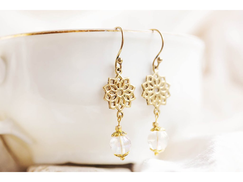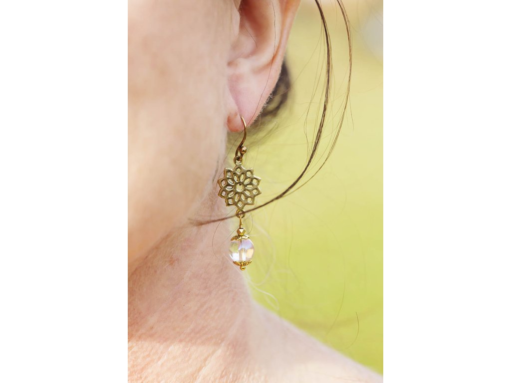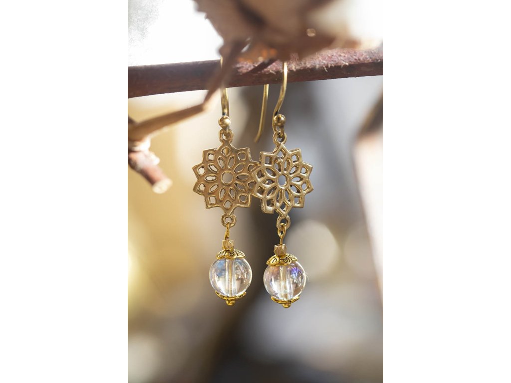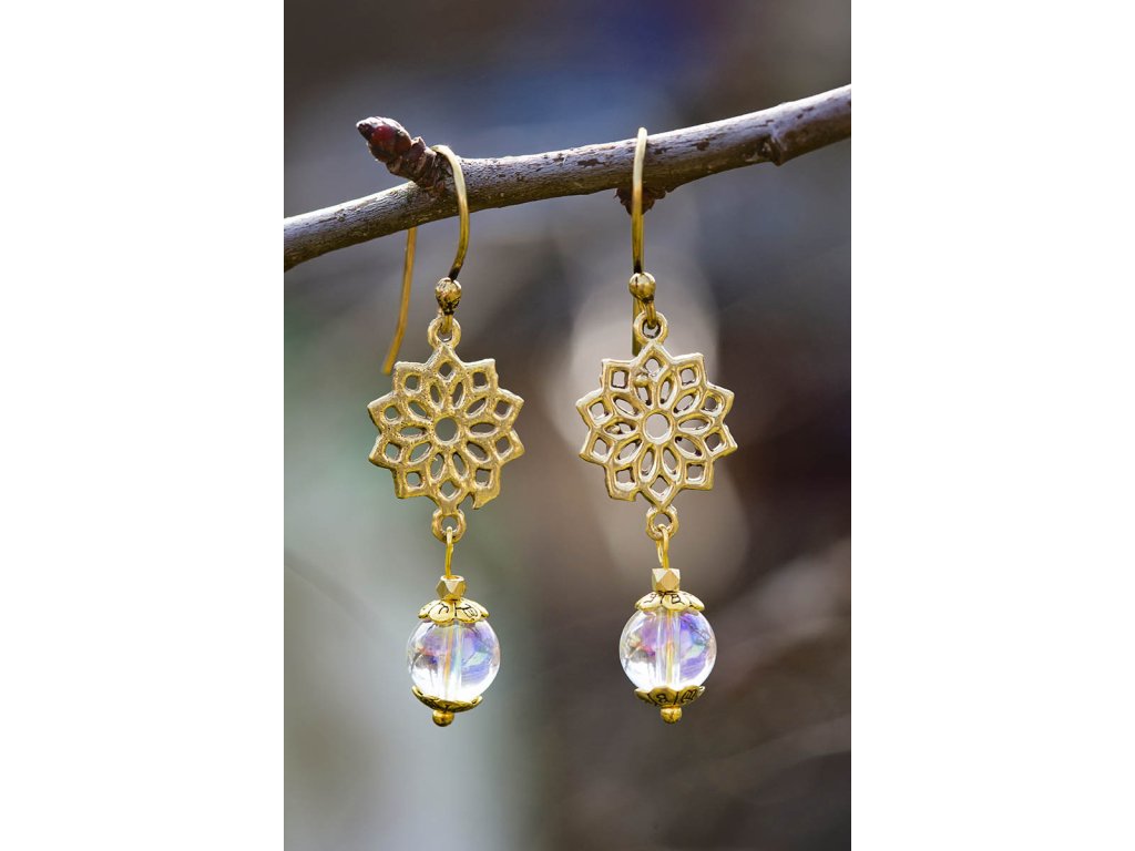 Náušnice Sahasrára Mosazný znak pro 7.čakru a jemný aqua aura křišťál tvoří tyto nádherné náušnice Sahasrára. Pohladí vaše oko i vaši duši. Sahasrára – 7. čakra nazývaná korunní je mostem mezi člověkem a bohem spojující fyzickou i duchovní sféru naší existence. Prostřednictvím této čakry rozvíjíme svojí intuici, moudrost, soucit, inteligenci a spirituální vnímání světa. Dále ovlivňuje náš duchovní vývoj i energetické hladiny ostatních čaker, a proto je velmi důležité mít jí v harmonii. Křišťál je jedinečný kámen, který uvádí energii svého nositele do harmonie, zesiluje jí a tím povzbuzuje psychiku, jasnozřivost a samostatnost a sebezdokonalení. Ochraňuje před zlými a negativními silami. Harmonizuje, čistí a chrání auru a tím zajišťuje klidný spánek. Je vhodný pro meditace a magické účely. Hmotnost jedné náušnice cca 0,5 gDoplňkové parametry