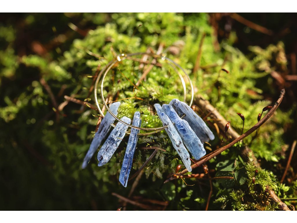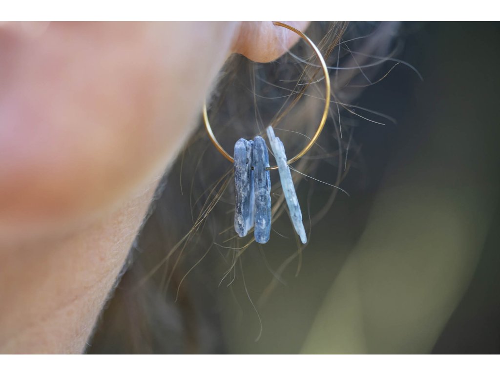 Náušnice se třemi kyanity Divotvorný tajemný kyanit s tenkým mosazným pozlaceným kroužkem. Tyto náušnice se třemi kyanity musíte mít. Jsou originální a velmi elegantní. Kyanit je nesmírně uklidňující kámen, který nás dokáže podpořit ve stresových situacích, ochrání před negativními energiemi a napomáhá soustředění při dosažení cíle. Je spojován s krční čakrou, tudíž podporuje i naši komunikaci a napomáhá zlepšovat mezilidské vztahy. Je důležitým pomocníkem pro zklidnění a meditaci. Posiluje naši intuici a vede nás k pravdě. Podobné náušnice najdete zde. Průměr kroužku cca 3 cm Hmotnost jedné náušnice cca 3 gDoplňkové parametry