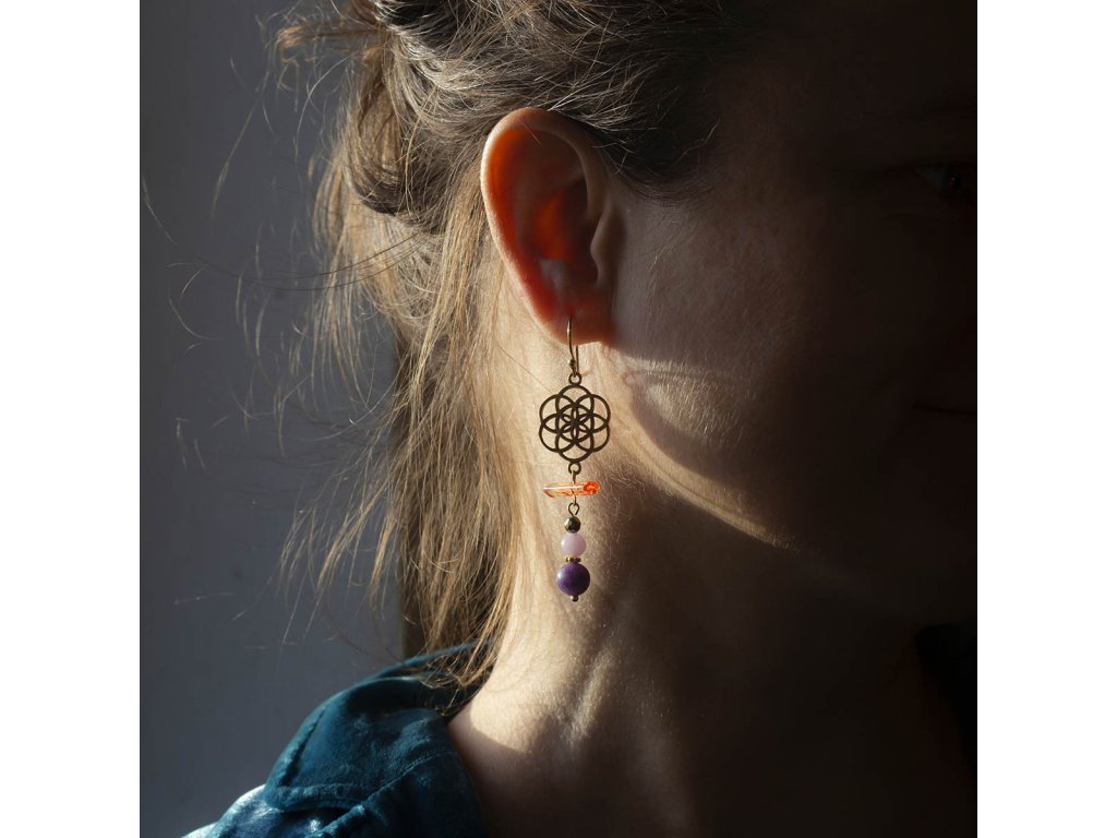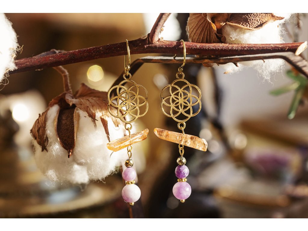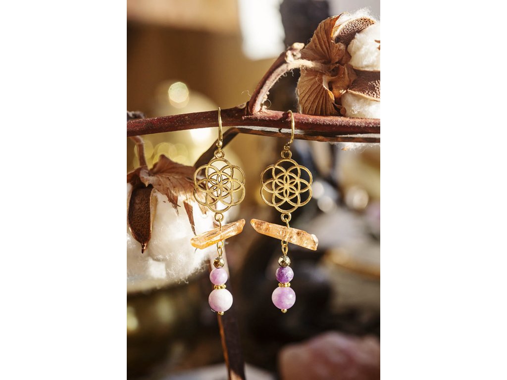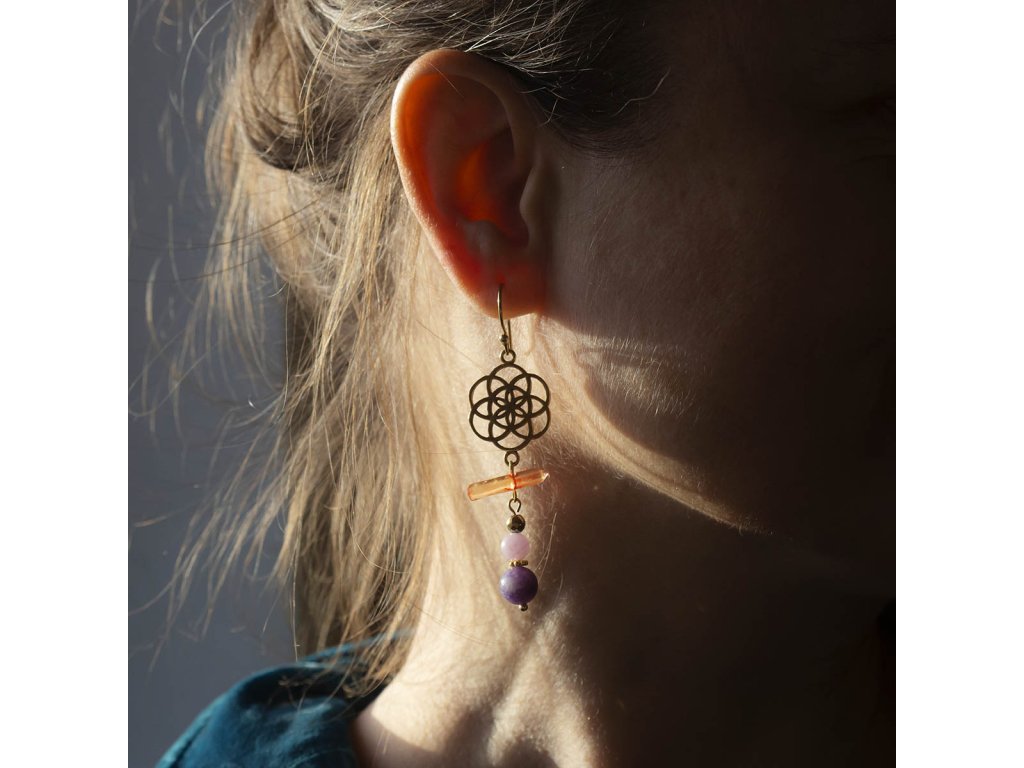 Náušnice Semeno života s čaroitem Překrásné náušnice Semeno života s mosazným symbolem, čaroitem, pokoveným hematitem a do oranžova zbarveným křišťálem. Semeno života je symbolem začátku stvoření. Je složeno ze sedmi kružnic. Středy těchto kružnic jsou položeny tak, aby jejich středy leželi na průsečíku první kružnice a jakékoliv další kružnice. Kružnic je celkem sedm, protože každá z nich je symbolem pro každý jeden den stvoření světa. V tomto semeni je také schován celý strom života – jeho kořeny, kmen, větve i květy. Čaroit je drahokam se silnou energií. Je velmi prospěšný svému nositeli, protože zmírňuje prožívání negativních emocí jako jsou strach, stres, obavy, frustrace, posedlost. Nepomáhá pouze s emocemi, ale i s dlouho upevněnými vzorci, které nám ztrpčují život. Odbourává také strachy z budoucnosti a vnáší jasný vhled do zamotaných situací. Pomáhá překonávat prokrastinaci a negativní energii umí přeměnit v klid a hojivý proces. Křišťál je jedinečný kámen, který uvádí energii svého nositele do harmonie, zesiluje jí a tím povzbuzuje psychiku, jasnozřivost a samostatnost a sebezdokonalení. Ochraňuje před zlými a negativními silami. Harmonizuje, čistí a chrání auru a tím zajišťuje klidný spánek. Je vhodný pro meditace a magické účely. Hematit je zvláště účinný při uzemnění a jako ochranný kámen. Uvádí do rovnováhy tělo, mysl i ducha. Nese v sobě silný element jang a zajišťuje rovnováhu meridiánů, čímž napravuje nevyváženost prvku jin. O hematitu se píše, že působí zvlášť blahodárně v situacích spojených s právem a zákony. Silně působí také v duševní rovině. Pomáhá plachým osobám zvyšovat sebevědomí a podporuje schopnost přežít. Dodává větší vůli k životu a rozvíjí spolehlivost. Zvyšuje rovněž důvěryhodnost. Tento kámen odstraňuje omezení, která si jeho majitel v minulosti sám stanovil, a napomáhá rozvoji osobnosti. Účinně asistuje při překonávání různých nutkání a návyků. Hematit obrací pozornost k nenaplněným touhám představujícím hnací motor lidského života. Délka cca 8 cm Hmotnost jedné náušnice cca 4 gDoplňkové parametry