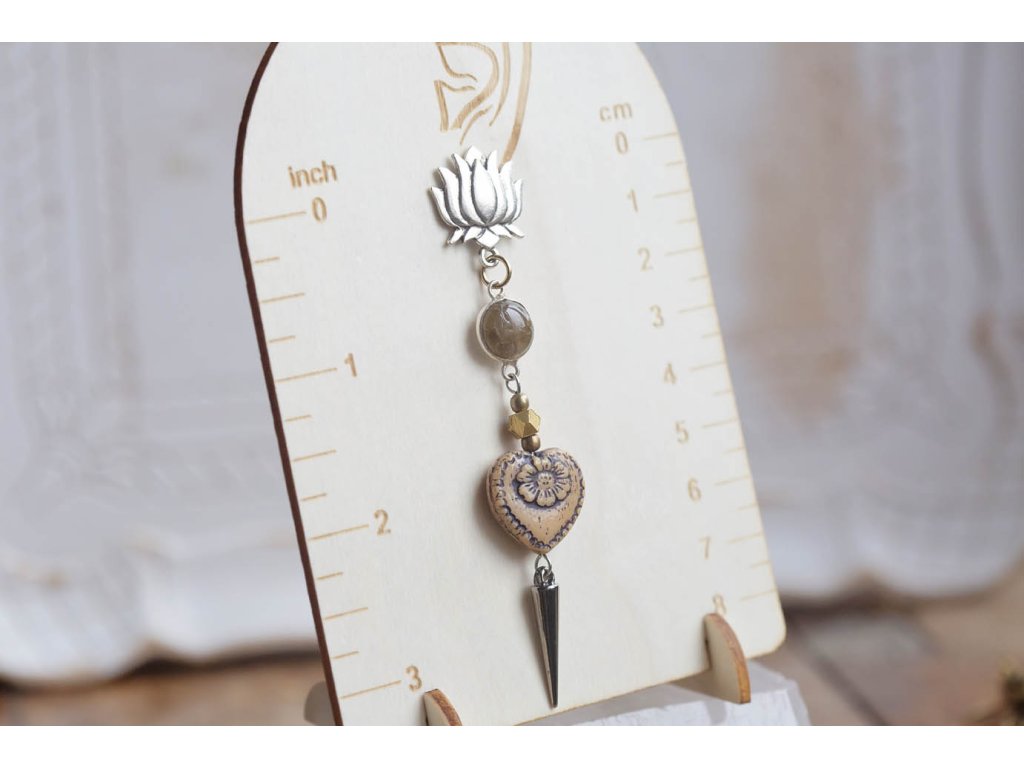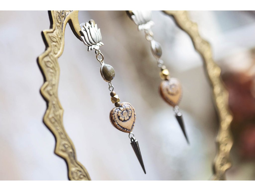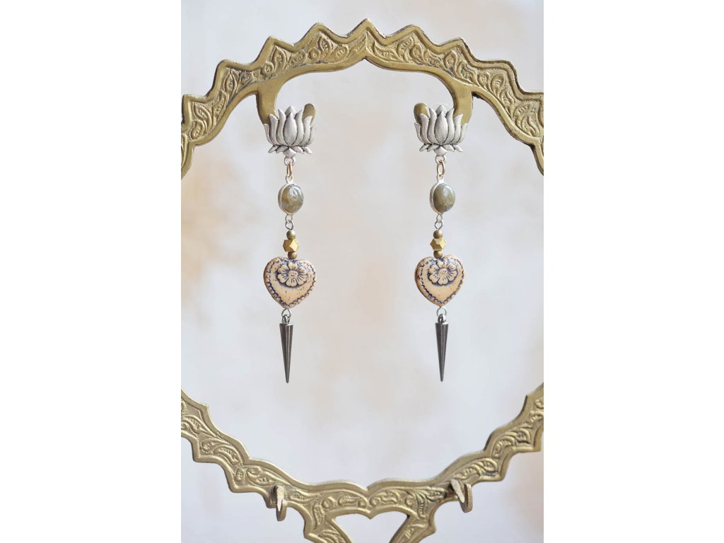 Náušnice srdce s lotosy Náušnice srdce s lotosy jsou z ezopunkové kolekce náušnic vzniklých na rovnodennost z nové inspirační vlny. Obsahují lotosové puzety ve stříbrné barvě, uvnitř jsou z mosazi. Jsou doplněné labradoritovými přívěsky rovněž z Indie a skleněná perníková srdce jsou výrobek českých sklářů. Jejich punkový nádech jim propůjčuje trash komponenta z rozebrané cetky, temně kovově zbarevný osten.Doplňkové parametry