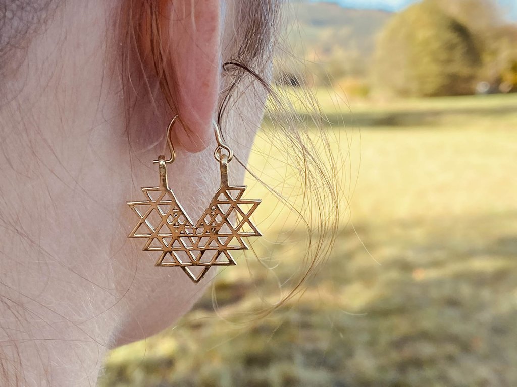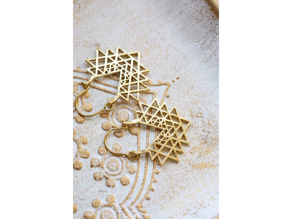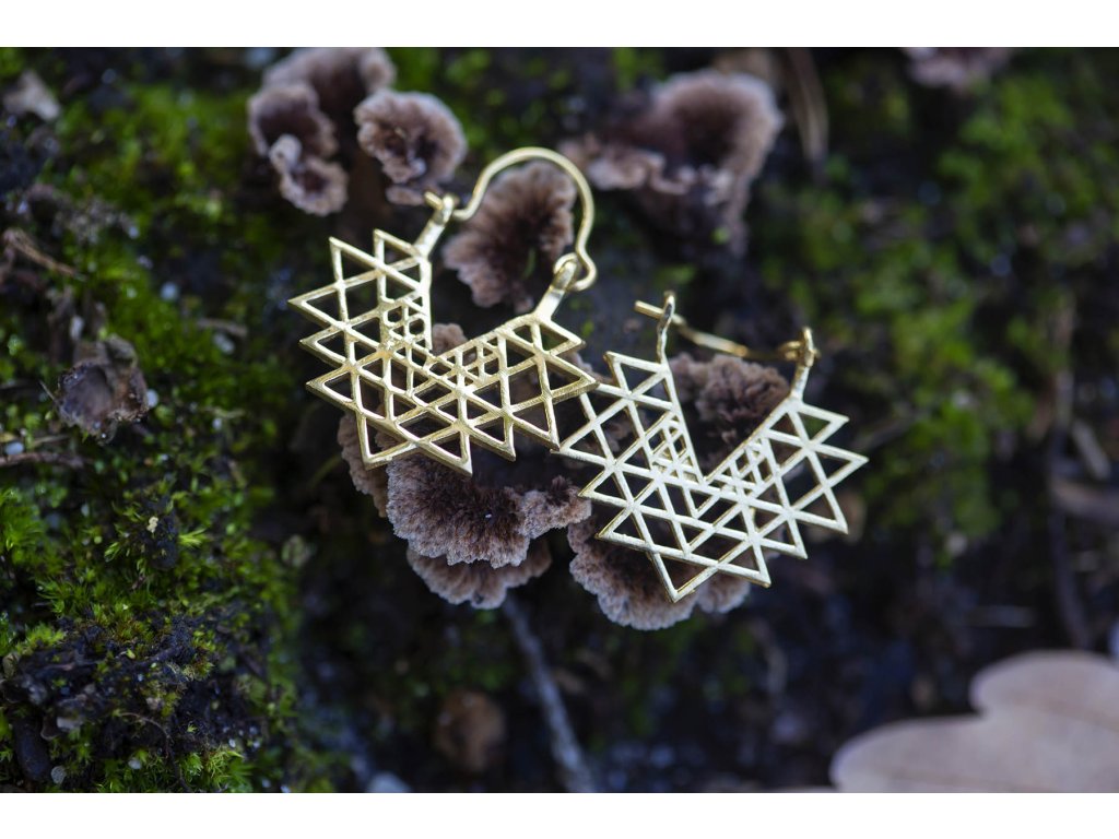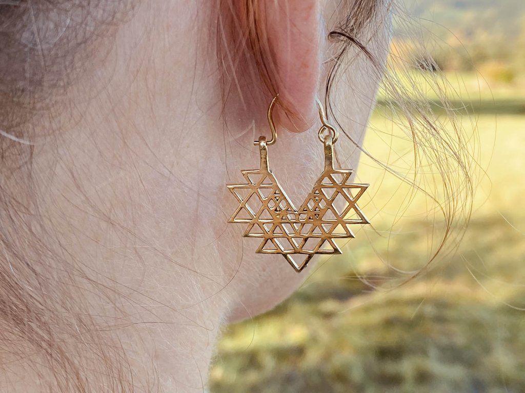 Náušnice šrí jantra Krása jedinečného mosazných náušnic se zde snoubí s účinky tohoto mocného symbolu šrí jantra. Jestli vás zaujaly, kupujte hned, máme jenom jedny. Symbol Šrí jantra představuje univerzální lásku, božskou harmonii, moudrost a mír. Funguje jako ochrana před negativními energiemi, napomáhá k udržení fyzického i psychického zdraví. Posiluje sebeovládání, vytrvalost a klid, usměrňuje city a tužby. Délka cca 3,5 cm Hmotnost jedné náušnice cca 3 gDoplňkové parametry