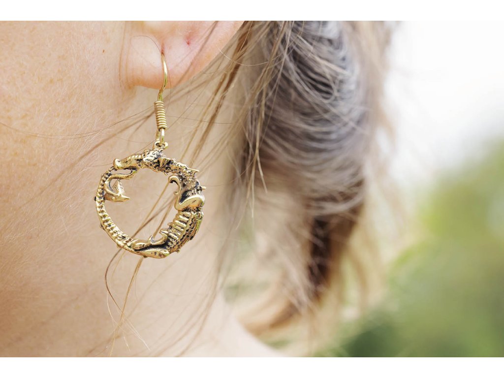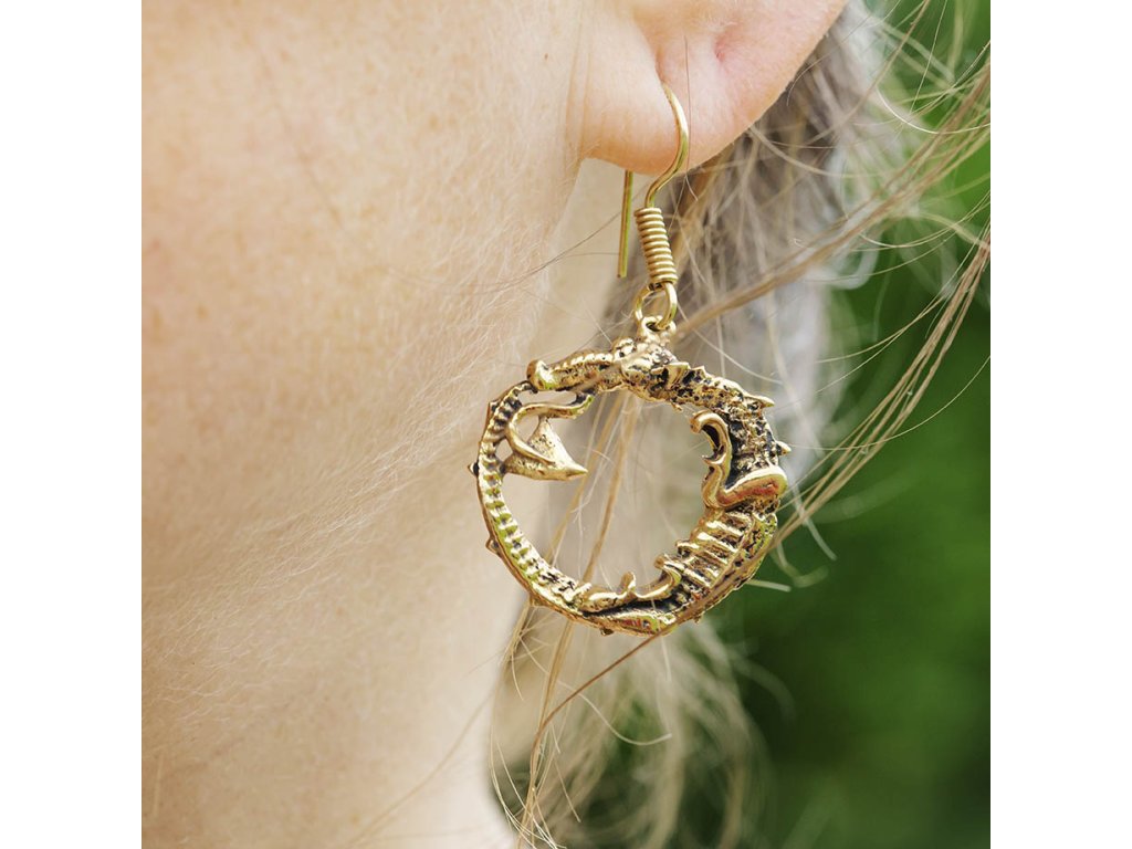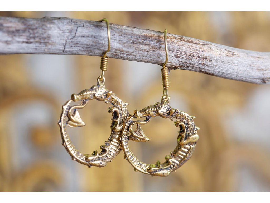 Náušnice uroboros Mosazné náušnice Uroboros. Uroboros, jeden z nejstarších symbolů znázorňuje hada nebo draka požírající svůj ocas. Toto znázornění symbolizuje cyklickou povahu života a vesmíru, zánik a zrod, život a smrt. Slučuje protiklady a tím přivádí pozornost k jednotě podobně jako jin a jang. Věčný souboj dobra a zla je jen konstruktem lidské dualistické mysli, ve skutečnosti je „Vše jedno“. A to je hlavní poselství tohoto symbolu. Průměr cca 2,5 cm Hmotnost jedné náušnice cca 5 gDoplňkové parametry