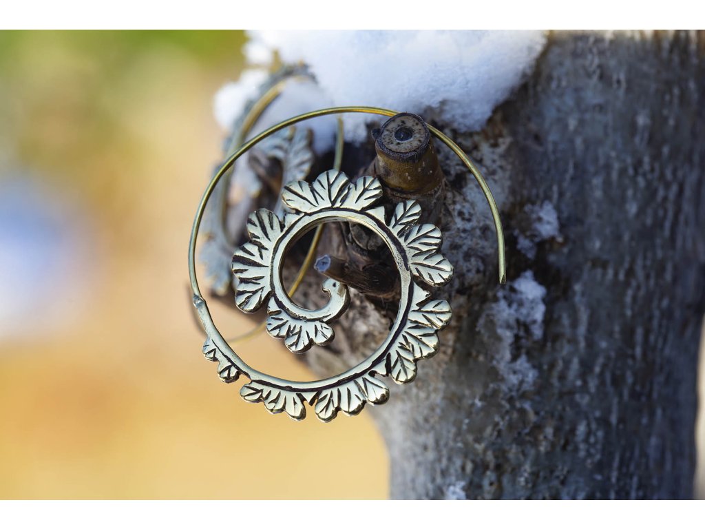 Náušnice větvička ve spirále Krásné mosazné náušnice připomínající listnatou větvičku zatočenou do spirály. Průměr cca 5 cm Hmotnost jedné náušnice cca 8 gDoplňkové parametry