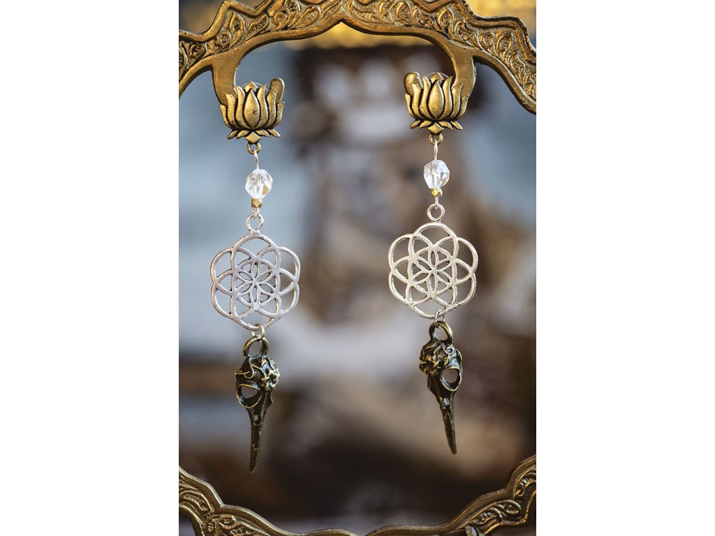 Náušnice Žabiona Fever Kubicky fasetované křišťály podpořené semeny života, která vyrůstají z ptačích lebek - symbolů pomíjivosti, vyživují jako kořeny květy lotosu a dávají vláhu jejich kráse. Tyto náušnice jsou pro Žabionu Fever, bytost z kouzelného světa autorčiny fantazie. Toto je jediný trash art ručně zpracovaný unikát, druhé takové nebudou, tak neváhejte! Křišťál je jedinečný kámen, který uvádí energii svého nositele do harmonie, zesiluje jí a tím povzbuzuje psychiku, jasnozřivost a samostatnost a sebezdokonalení. Ochraňuje před zlými a negativními silami. Harmonizuje, čistí a chrání auru a tím zajišťuje klidný spánek. Je vhodný pro meditace a magické účely. S lotosem se často setkáváme v prastarých kulturách různých národů. Je symbolem znovuzrození, krásy, života, štěstí, čistoty a duchovnosti, jednoty mikro a makrokosmu, symbolem rovnováhy mužského a ženského počátku. Lotosový květ napomáhá zrození harmonie a lásky uvnitř nás. Semeno života je symbolem začátku stvoření. Je složeno ze sedmi kružnic. Středy těchto kružnic jsou položeny tak, aby jejich středy leželi na průsečíku první kružnice a jakékoliv další kružnice. Kružnic je celkem sedm, protože každá z nich je symbolem pro každý jeden den stvoření světa. V tomto semeni je také schován celý strom života – jeho kořeny, kmen, větve i květy. Délka cca 11 cm Hmotnost jedné náušnice cca 11 gDoplňkové parametry