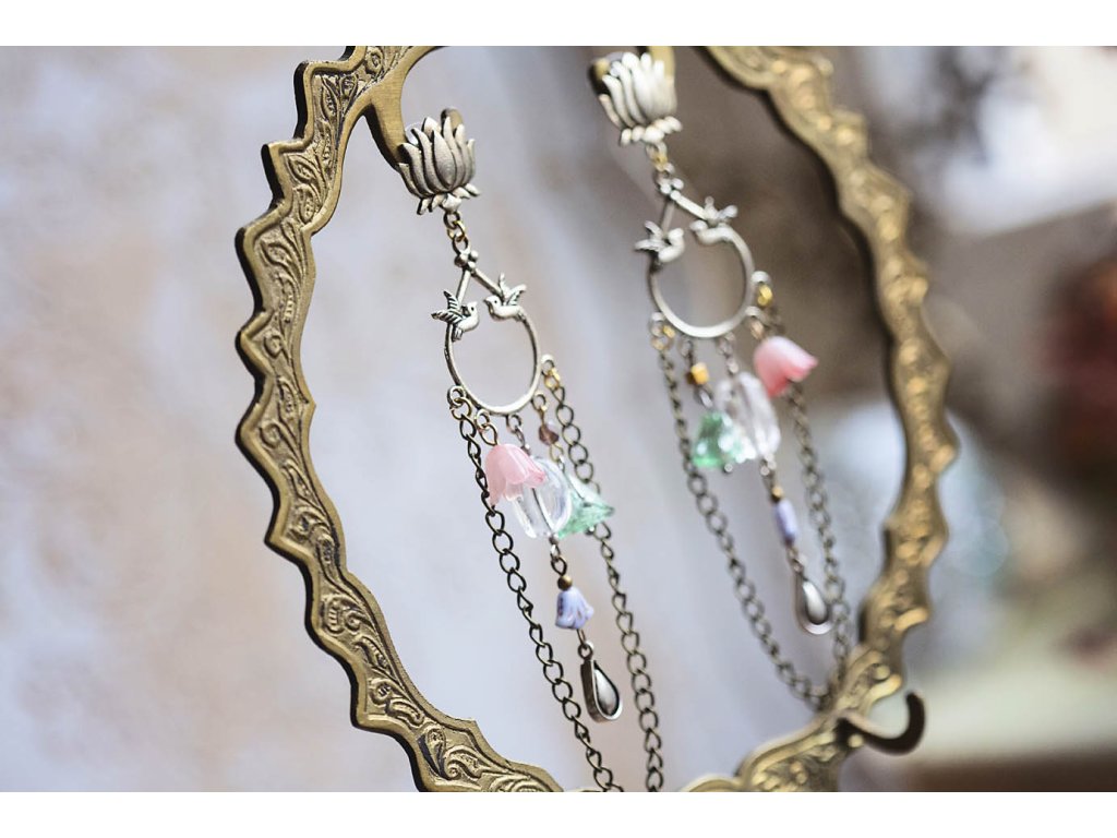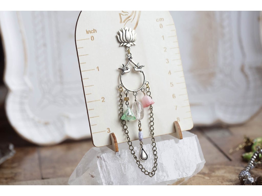 Náušnice Zamilovaní kolibříci Tyto náušnice mají moje oblíbená slitinová ramínka, která jsem si nazvala Zamilovaní kolibříci. Z nich ústí krásné mosazné postříbřené puzety ve tvaru lotosů. Dole ve větru a pohybu tančí zvonky od českých sklářů i obyčejnějšího původu, masivnější kousek křišťálu a to celé orámoval mosazný řetízek který přišel bůhvíodkud.Doplňkové parametry