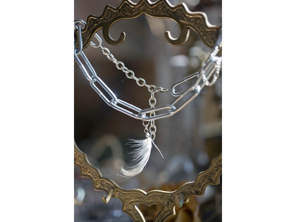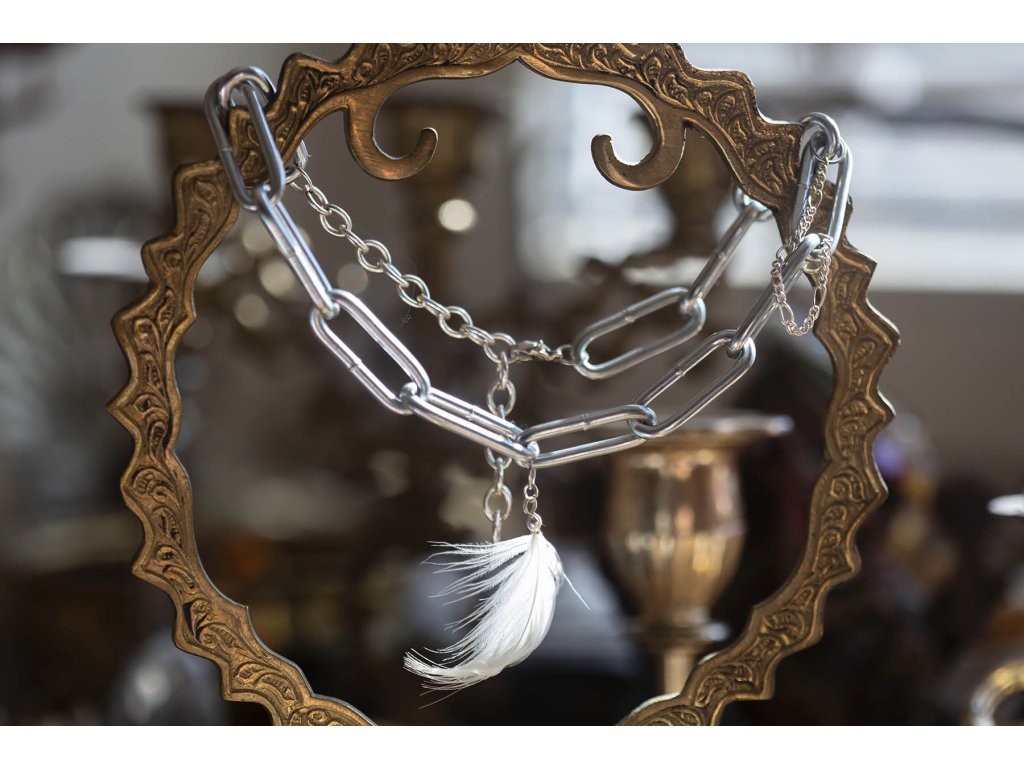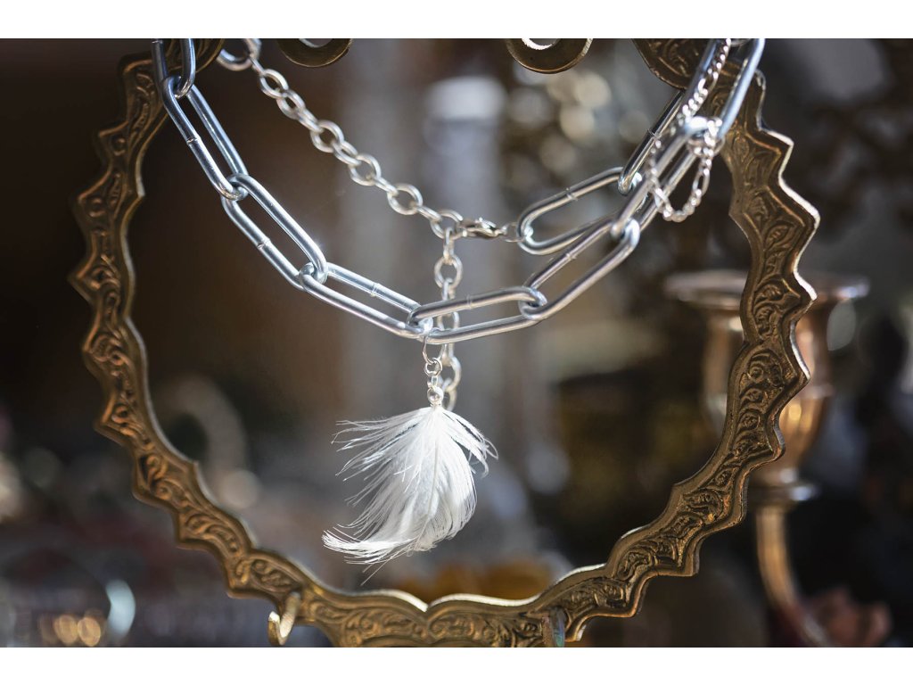 Peříčkový choker Peříčkový punkový choker, ve kterém punková víla s ochranou labutího pírka, udělá parádu v klubu i za magického svítání na říčním ostrově plném zpěvu ptactva uprostřed probouzejícího se velkoměsta. Maximální délka cca 42 cm, obvod jde zkrátit. Hmotnost cca 51 gDoplňkové parametry