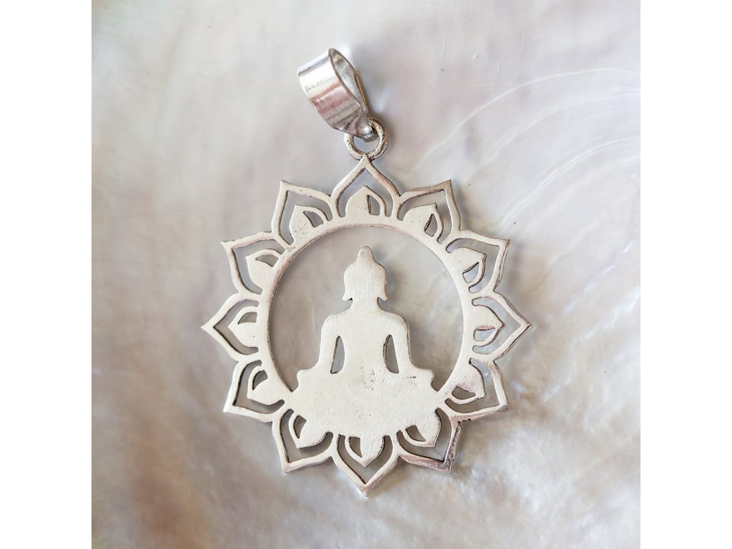Přívěsek Budha v lotosu Alpakový přívěsek pro každou jogínku. Průměr: cca 39 mm Hmotnost: cca 6 g