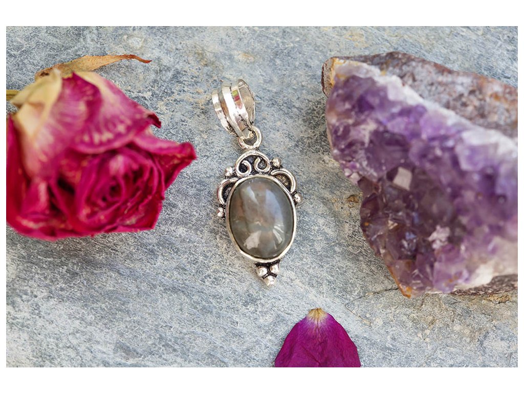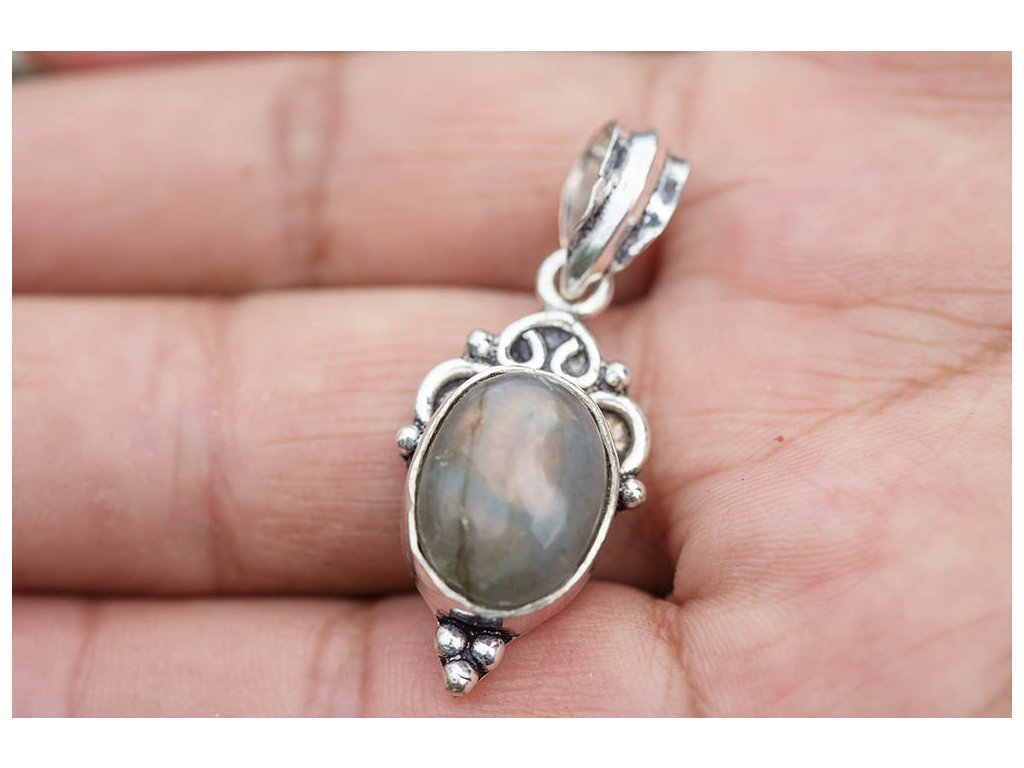 Přívěsek labradorit Krásný labradorit zasazený do mosazi potažené alpakou, tvoří tento přívěsek. Labradorit je vhodný pro bytost, která je připravená ukázat světu své skryté hlubiny. Vynáší na povrch to, co před světem ukrýváme a osvobozuje naši osobnost od starých vzorců a zábran. Odložením zábran se navrací do života spontánnost a radost. Je to také ochranný kámen šamanů a mágů, aby nesešli z cesty při propojování různých dimenzí a světů, přináší světlo, které rozjasňuje tuto cestu. Délka i se závěsem cca 3,5 Hmotnost cca 6 gDoplňkové parametry