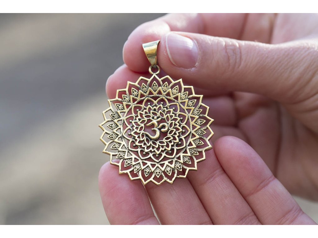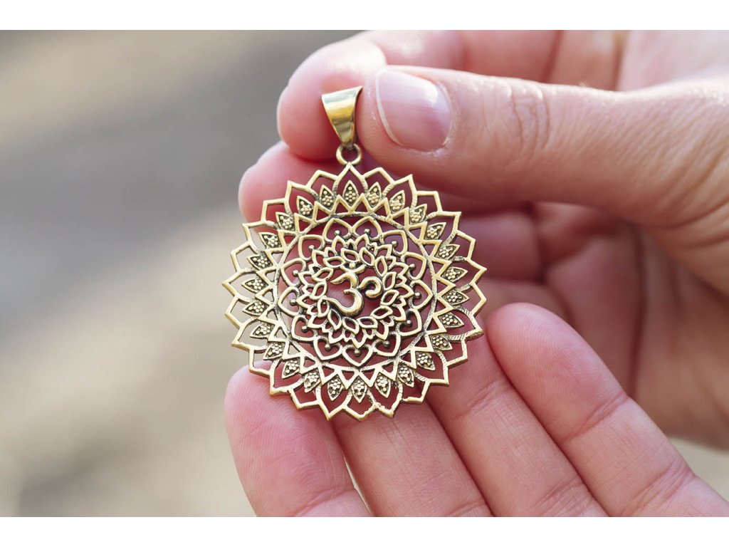 Přívěsek óm v lotosu Krásný zdobný mosazný přívěsek a magickými symboly óm a lotos. Óm je prastará mantra, která se často zpívá při jogínských cvičeních. Óm je ale i symbol, který má náboženský význam a hloubku. Je to zvuk stvoření vesmíru i zvuk ticha. Představuje nejvyšší božskou úroveň a cestu l osvícení. Symbol napomáhá ke zklidnění mysli, vytvoření pokojného prostředí a dosažení vyšší úrovně vědomí. S lotosem se často setkáváme v prastarých kulturách různých národů. Je symbolem znovuzrození, krásy, života, štěstí, čistoty a duchovnosti, jednoty mikro a makrokosmu, symbolem rovnováhy mužského a ženského počátku. Lotosový květ napomáhá zrození harmonie a lásky uvnitř nás. Průměr: 40 mm Hmotnost: 11 gDoplňkové parametry